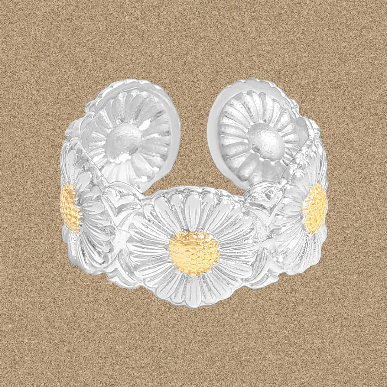 • Style: Designed as an open cuff, the ring features a continuous band of beautifully sculpted daisies, offering a free-flowing and elegant silhouette that echoes the organic flow of nature.