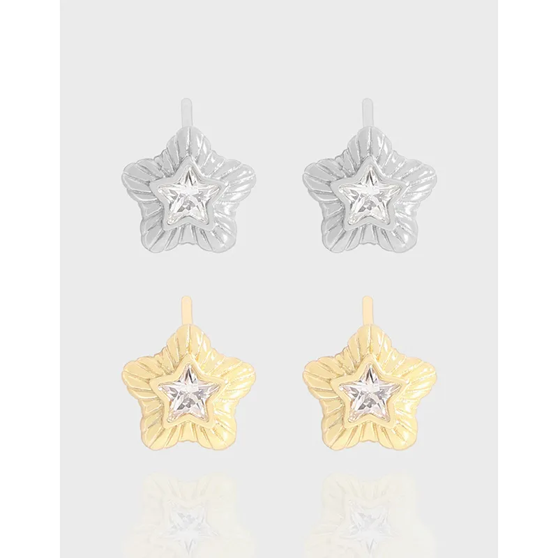 These enchanting stud earrings capture celestial beauty in two radiant metallic finishes: lustrous gold and elegant silver. Each pair showcases a charming five-pointed star design, perfect for adding a touch of magic to your everyday look or a special occasion.