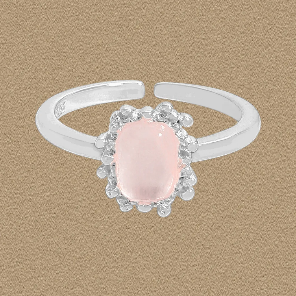 Discover an ode to nature’s magic with the Malisse adjustable ring. This captivating piece features a smooth, polished oval cabochon of pale, milky pink, embodying the delicate hues of dawn and the serene beauty of the earth’s heart. Encircling the centerpiece is an organically shaped halo of lustrous silver, meticulously crafted with raw, textured details that shimmer like celestial dust, reflecting Malisse’s appreciation for imperfect beauty and fluid forms.