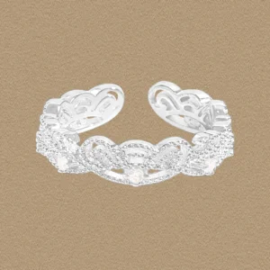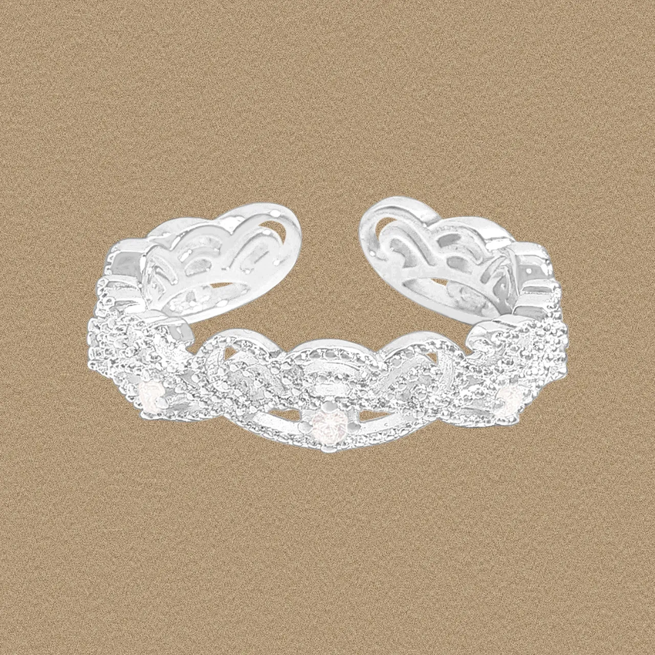 • Smooth, polished silver sections provide a lustrous contrast to the stone-studded areas, while subtle openwork details on the inner band add an airy, delicate finish.