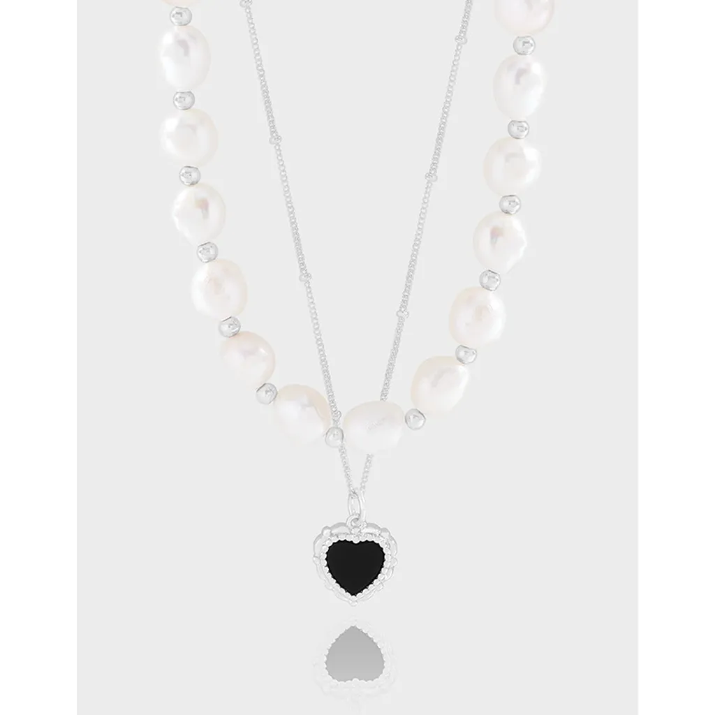 This elegant layered necklace combines the timeless beauty of lustrous white freshwater pearls with the sleek appeal of silver-toned metal. It features two distinct strands: one adorned with organically shaped pearls interspersed with small polished silver beads, and another delicate silver chain that holds a captivating heart-shaped pendant.