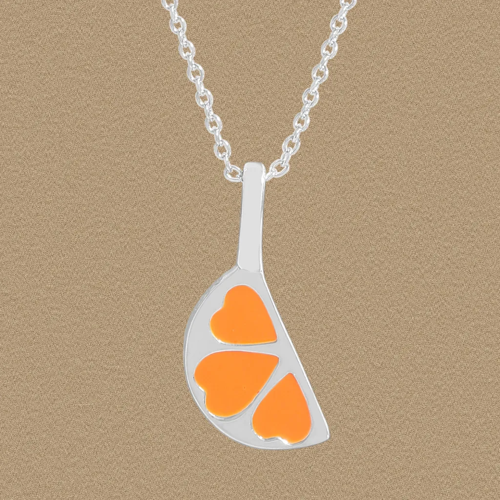 The core of this design features an enchanting pattern of three distinct heart shapes, meticulously formed within the stylized fruit slice. These hearts, filled with smooth, vibrant orange, create a delightful focal point. The silver components boast a sleek, highly polished texture, providing a lustrous finish, while the standard link chain offers a classic, fine-textured detail that complements the pendant’s contemporary design.