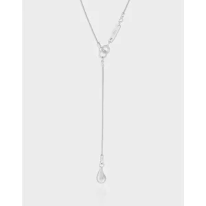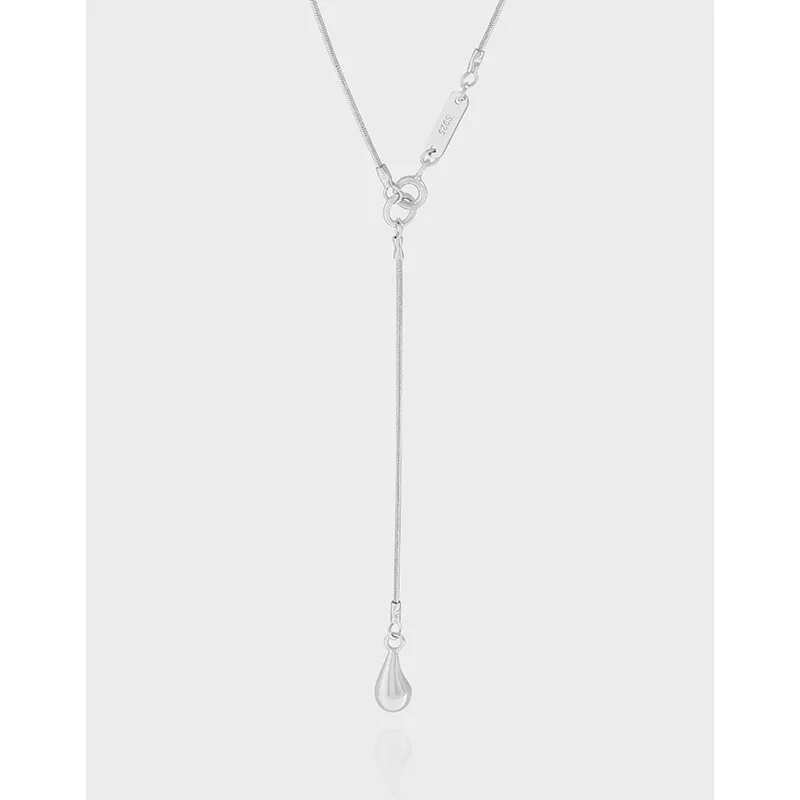 - Patterns & Textures: The piece showcases a smooth, continuous snake chain that drapes with remarkable fluidity, offering a soft, refined texture against the skin. At its graceful descent, a perfectly polished, reflective teardrop pendant gleams, embodying the serene beauty of a dewdrop or a celestial body.