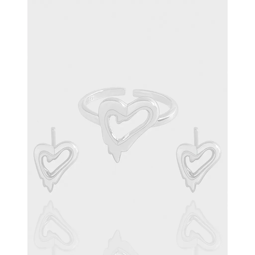 - Style: A modern and artistic take on the classic heart motif, featuring a distinctive “drip” silhouette that conveys a sense of dynamic elegance and fluid grace. The ring is adjustable for a comfortable fit, complemented by matching stud earrings.