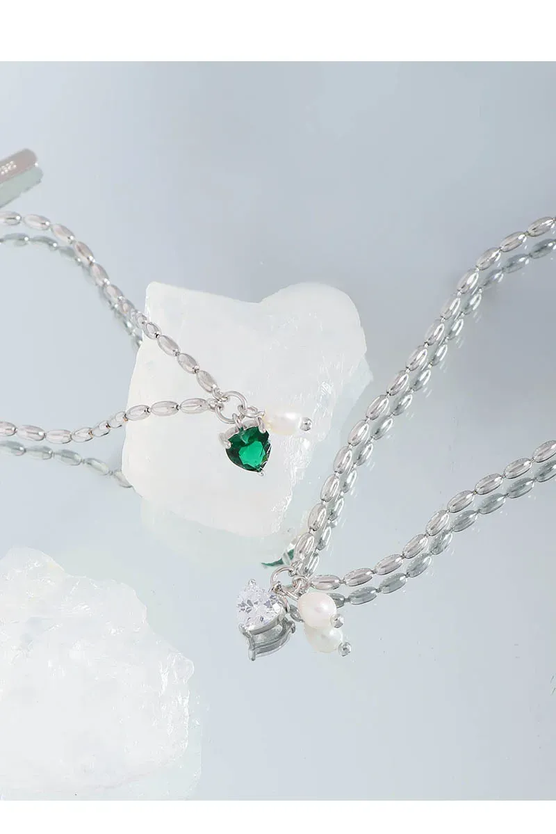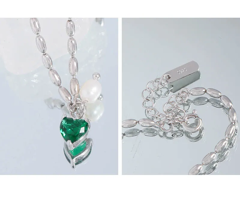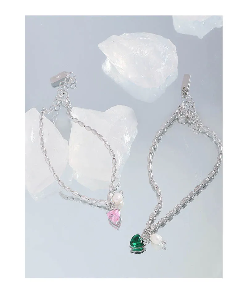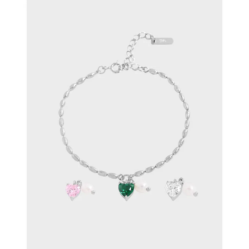 - It features a captivating emerald green heart-shaped gemstone, a soft rose pink heart-shaped gemstone, and a brilliant clear heart-shaped gemstone.