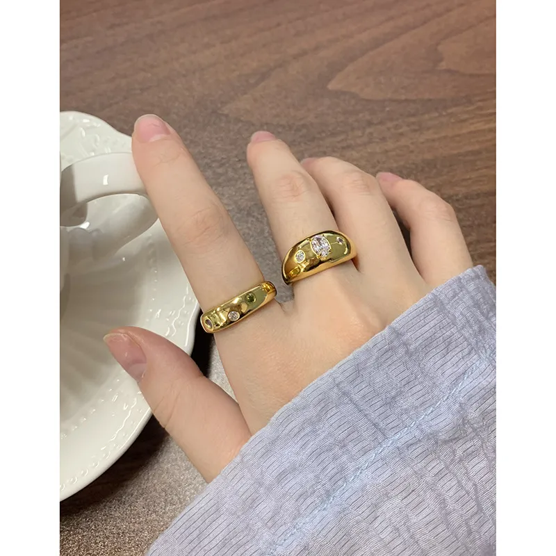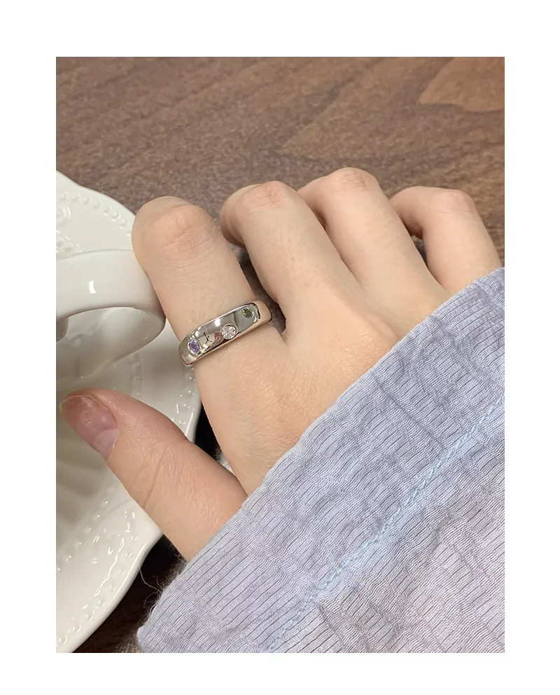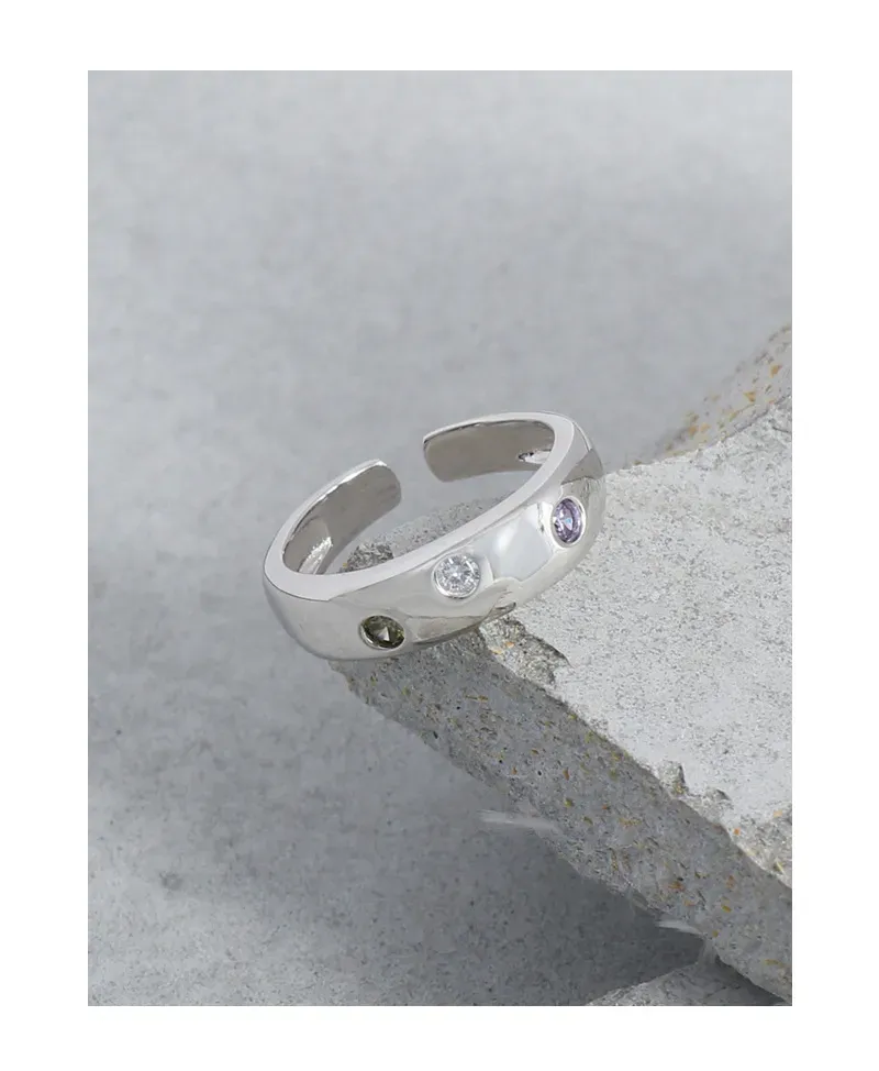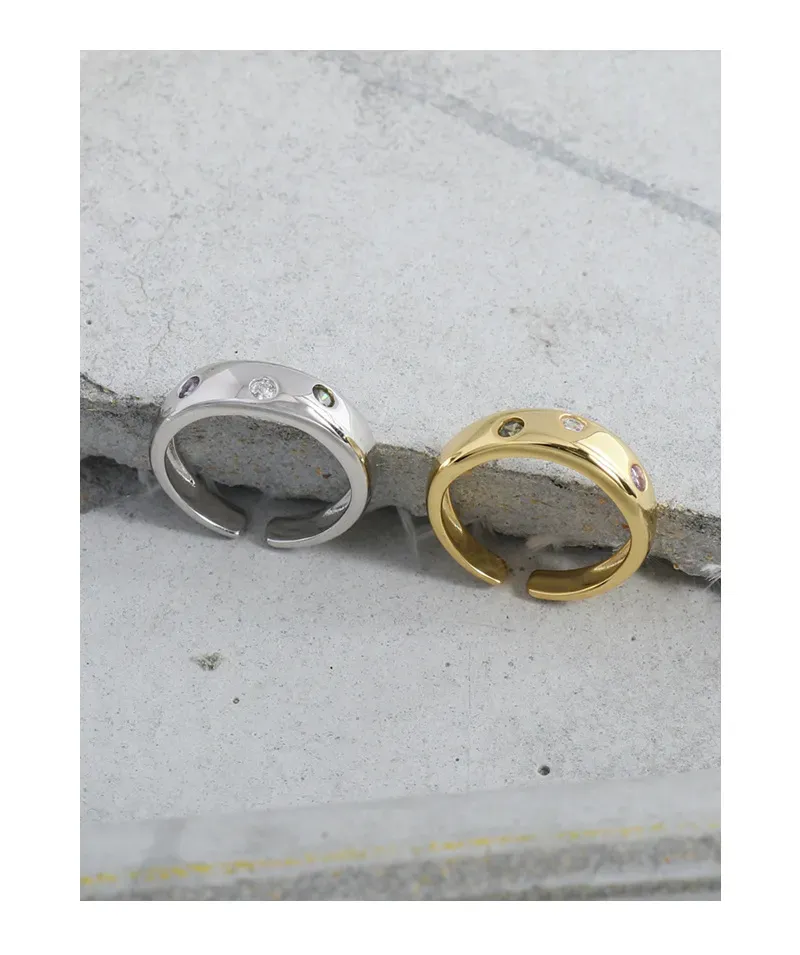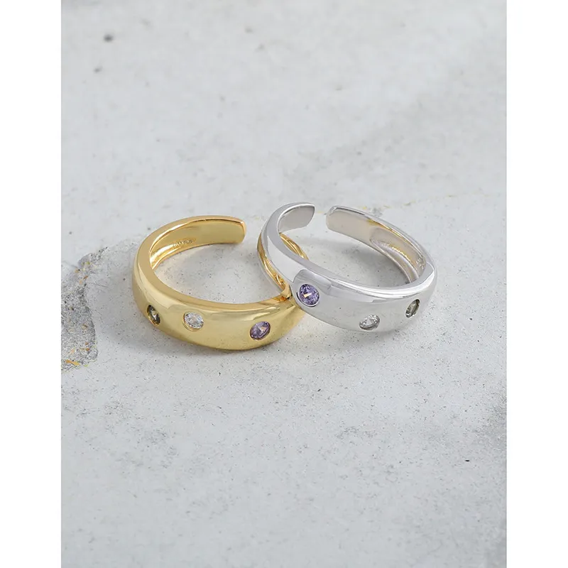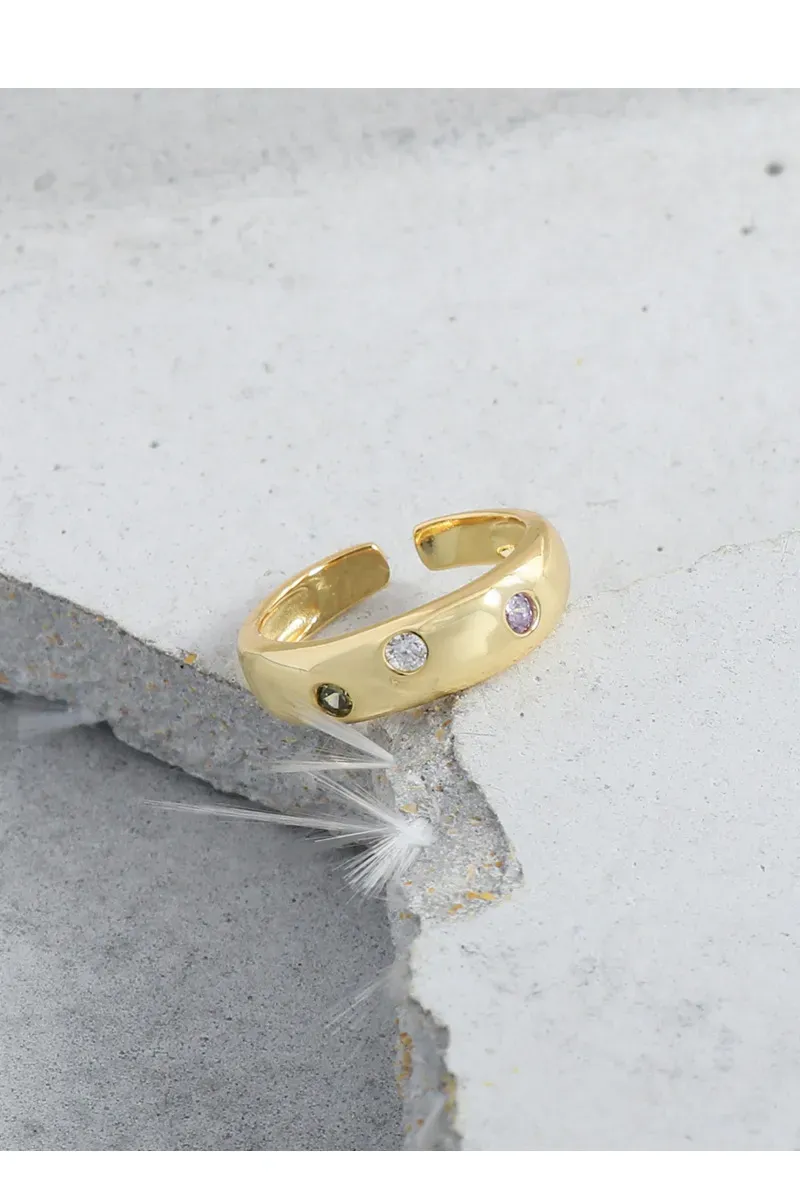 - Color: Crafted from radiant gold-toned metal, the ring is adorned with three round, flush-set gemstones. These include a shimmering clear stone, a captivating deep smoky grey, and a delicate, soft lavender, echoing the varied hues of the northern lights.