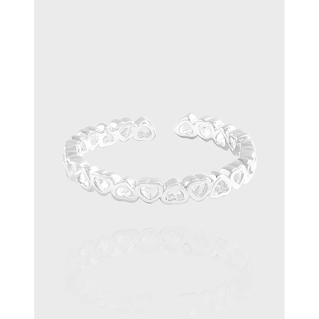 - Patterns or Textures: The band is adorned with a continuous series of finely detailed heart shapes, each one smooth and luminous. This intricate pattern creates a beautiful texture that evokes the subtle, captivating artistry found in nature.