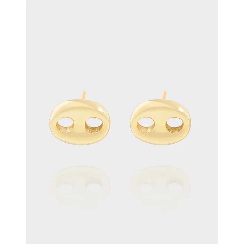 • Style: Modern and abstract stud Amorine Earrings, featuring a unique elongated oval shape with two symmetrical circular cut-outs. This fluid, artistic design provides a contemporary edge.