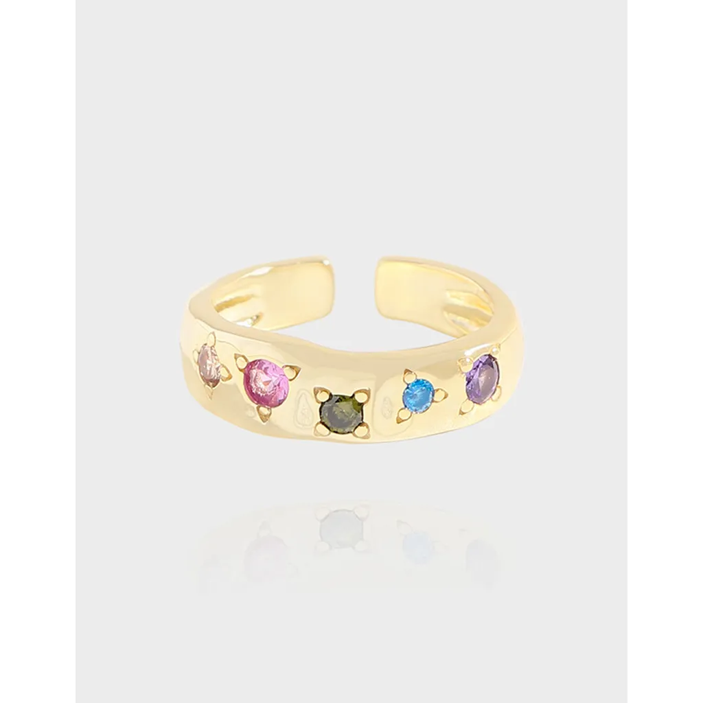 Embrace the magic of the cosmos with this exquisite Malisse adjustable cuff ring. Crafted from gleaming gold, its fluid design cradles a constellation of vibrant, multi-colored gemstones, each reflecting a unique celestial hue. This piece captures the shimmeAmy Ring depth and imperfect beauty found in nature’s most enchanting displays, making it a truly unique adornment.