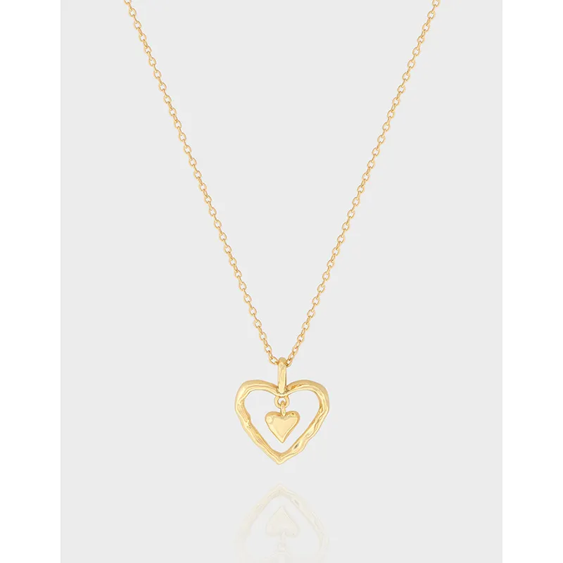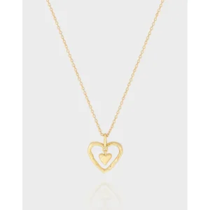 - Style: The centerpiece is a unique double-heart pendant. An outer heart, artfully shaped with fluid, organic contours and an ‘imperfect’ raw texture, gracefully frames a smaller, smooth, and classically formed inner heart. This layered design creates a harmonious blend of natural artistry and classic romance.