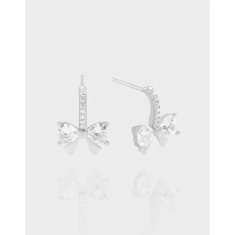 - Style: Featuring an enchanting bow design, each earring is adorned with two central heart-shaped faceted stones. The elegant curved top section is pave-set with smaller brilliant stones, creating a sophisticated and feminine silhouette.