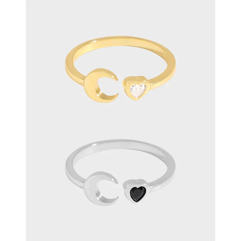 - Patterns & Textures: Crafted with a smooth, polished metal finish, the ring showcases distinct crescent moon and heart shapes. The bezel-set heart stone, whether clear or black, provides a subtle textural contrast and highlights the delicate balance of this cosmic-inspired design.