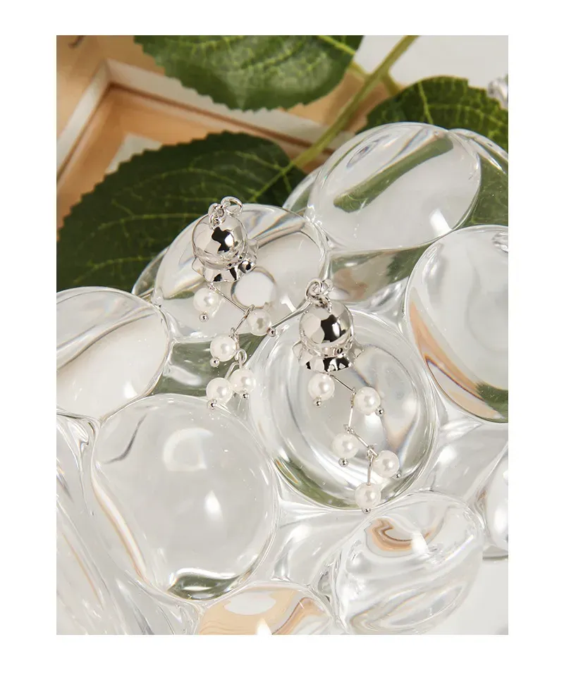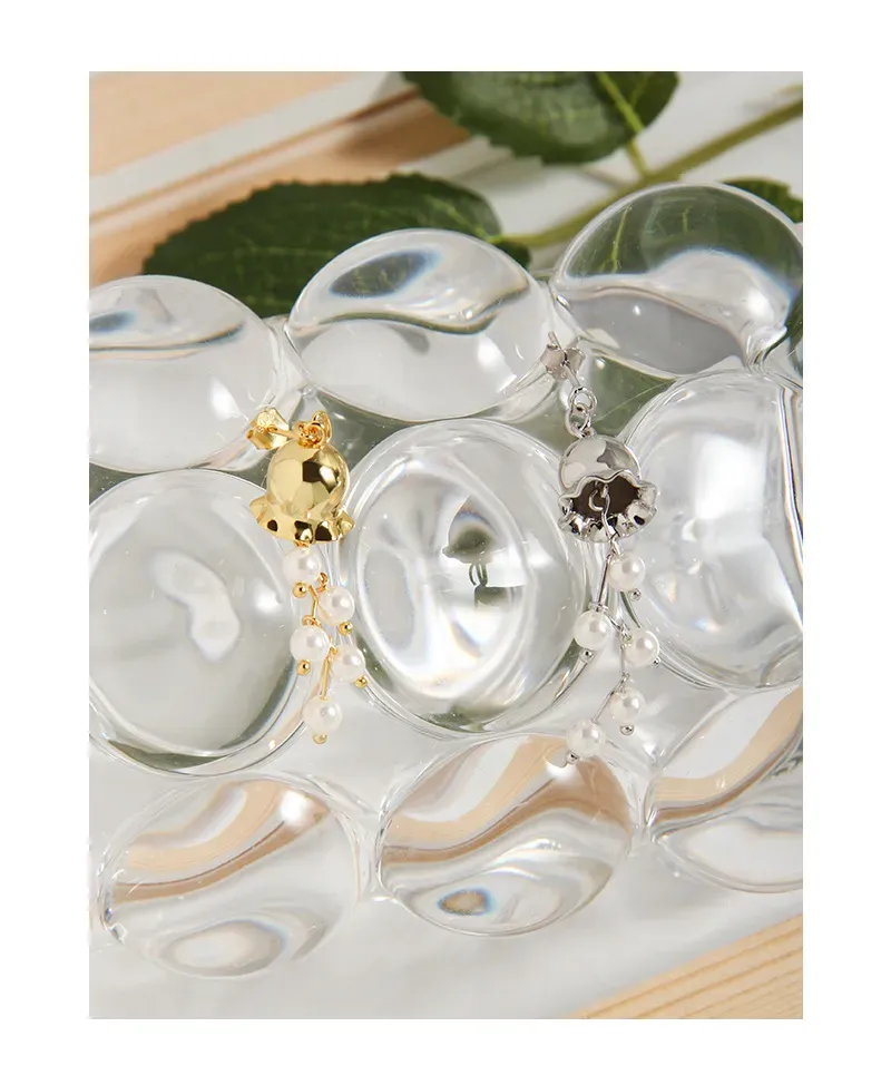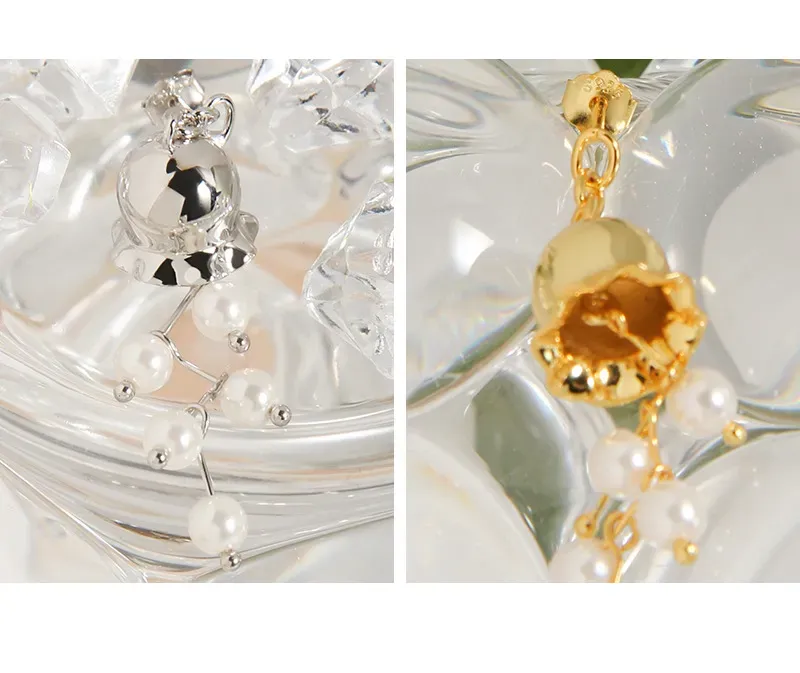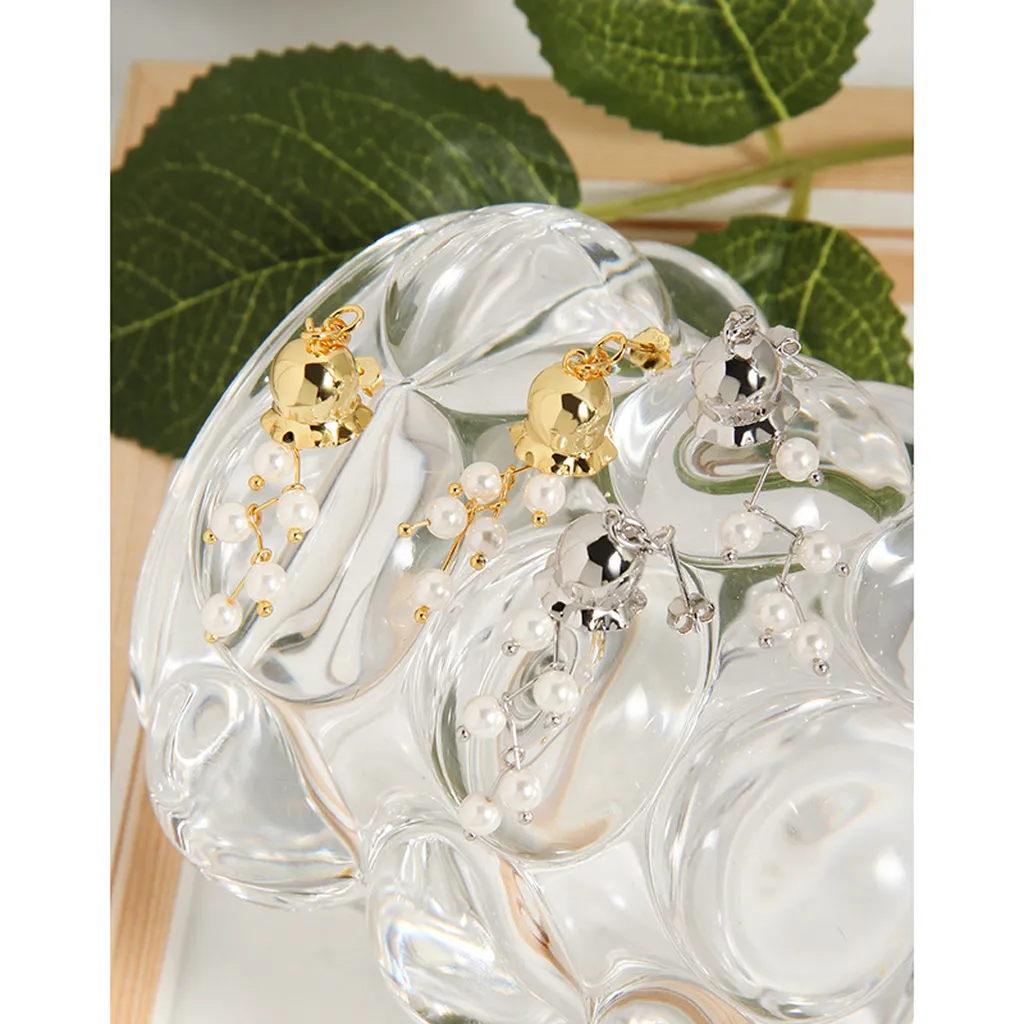 - Patterns or Textures: The design harmoniously blends smooth, reflective surfaces with the soft iridescence of pearls. The golden bells boast a polished, mirror-like texture on their domed tops, transitioning to a gently ruffled, organic edge. Below, clusters of smooth, perfectly round pearls are artfully arranged on fine golden wires, mimicking the delicate clusters of a flowering branch. This combination creates a rich visual and tactile experience, celebrating the imperfect beauty and raw textures inspired by the earth and sky.