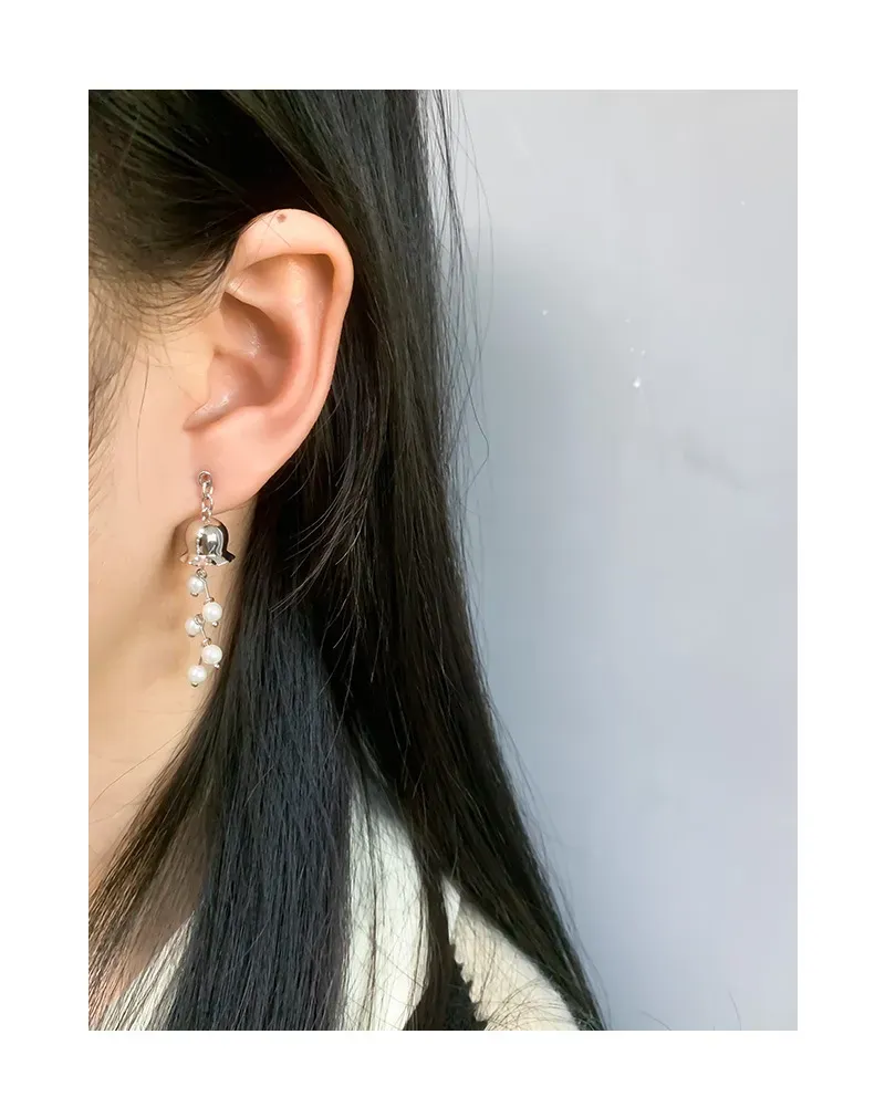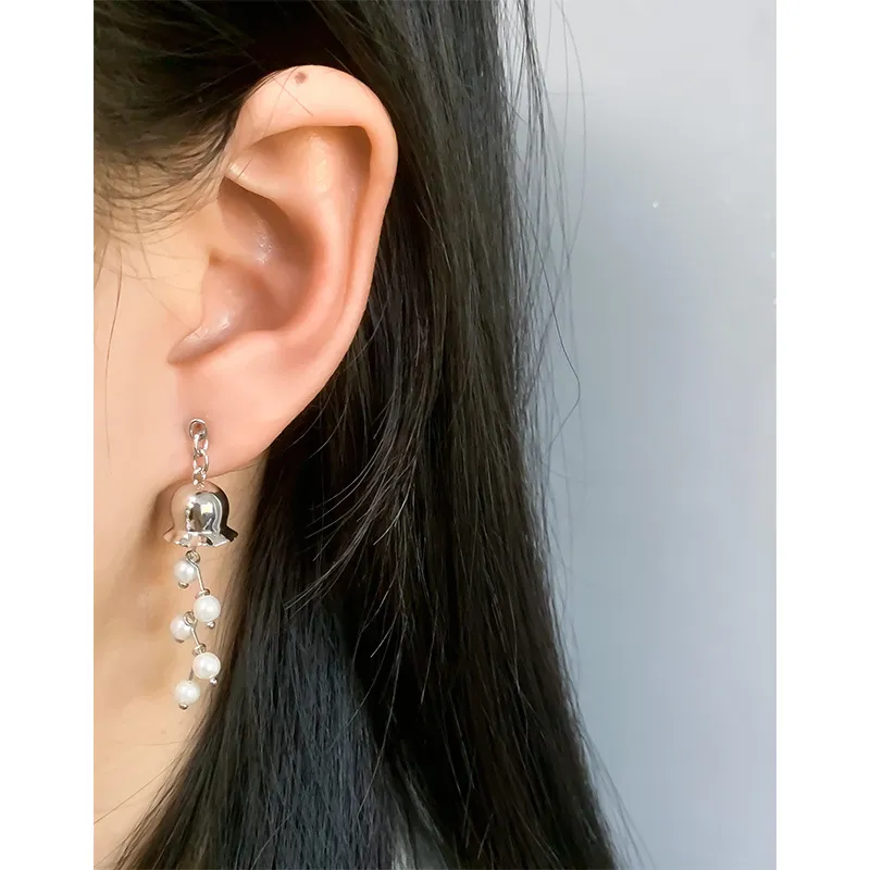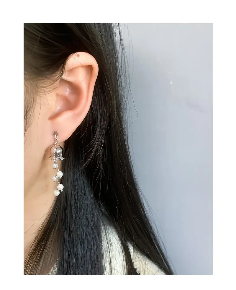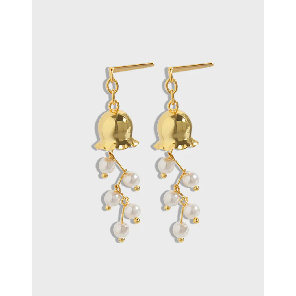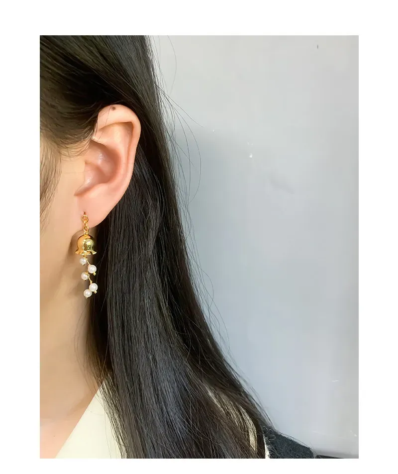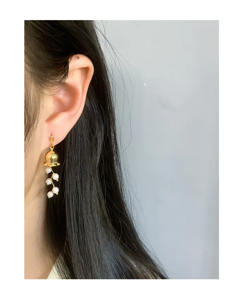 - Style: Inspired by the charming bell-shaped blooms of the lily of the valley, these dangle earrings exude a whimsical yet elegant aesthetic. Each earring showcases a gracefully flared golden bell from which delicate strands of pearls cascade, mirroring the fluid shapes and organic patterns found in nature. Their design offers a timeless charm, perfect for adding a touch of sophisticated natural beauty to any ensemble.