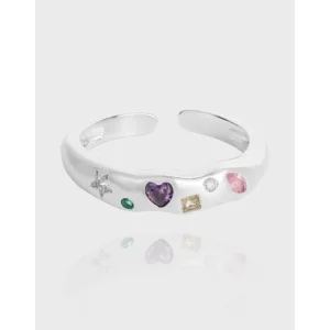 - Color: Crafted from lustrous silver, the ring provides a brilliant canvas for a vibrant array of multi-colored gemstones. Featuring a deep purple heart, a sparkling white round gem, a delicate pink oval, an elegant yellow rectangle, and a vivid green oval, each stone contributes to a harmonious spectrum of celestial hues.