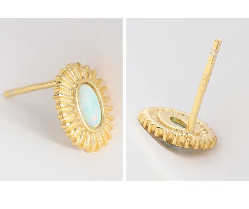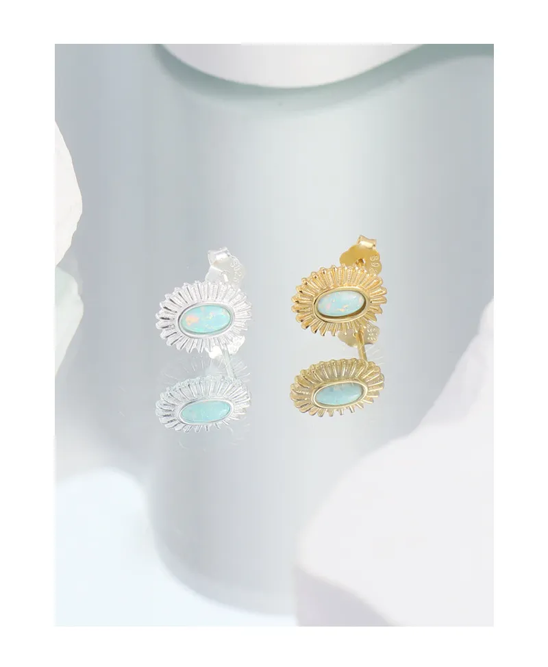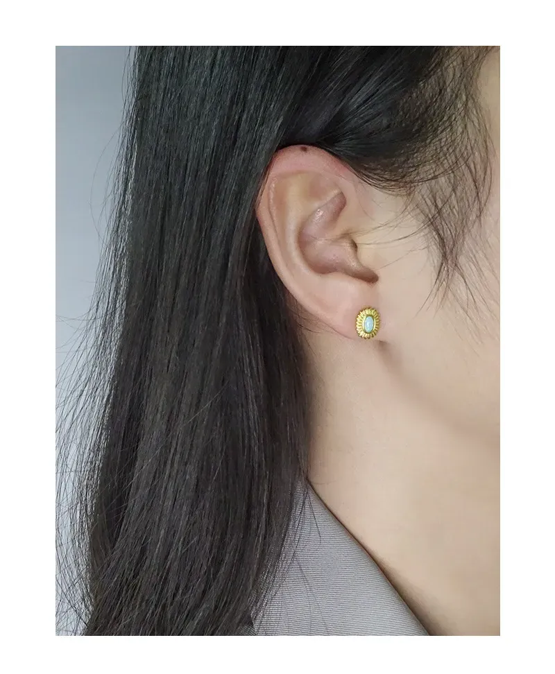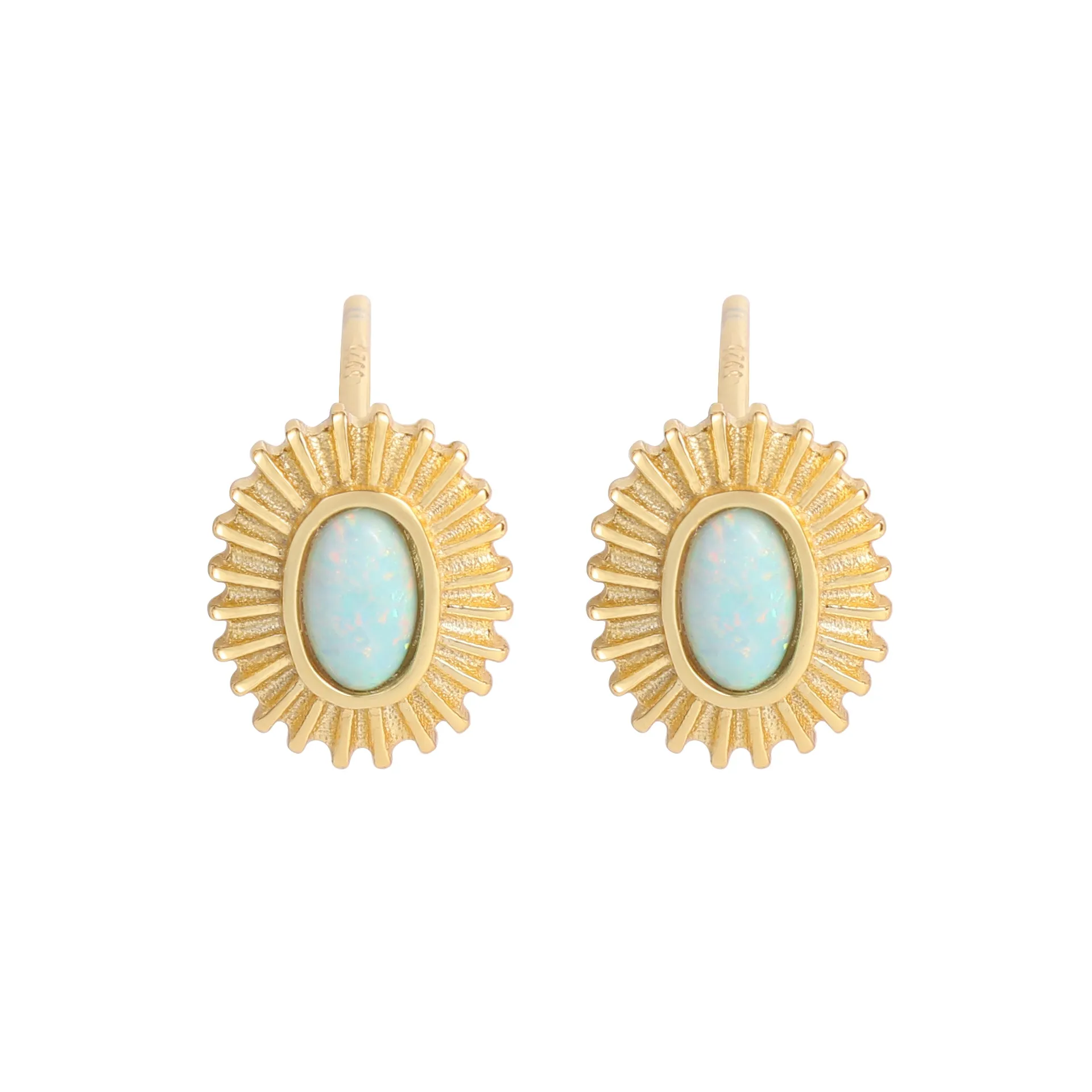 Capturing the essence of earth, sky, and light, the Araelindra Earrings boast a distinctive sunburst pattern. Finely textured gold rays radiate outward from the opal, creating an intricate and visually striking design that echoes the dazzling beauty of natural light phenomena. This harmonious blend of smooth, celestial opal and textured gold embodies Malisse’s commitment to transforming nature’s most enchanting moments into wearable art.