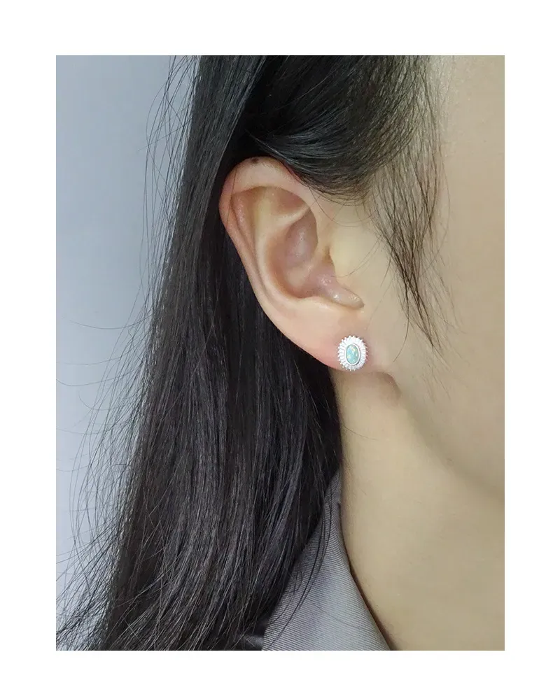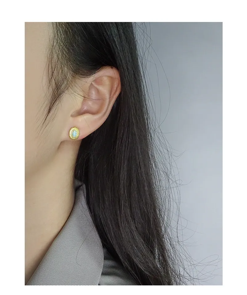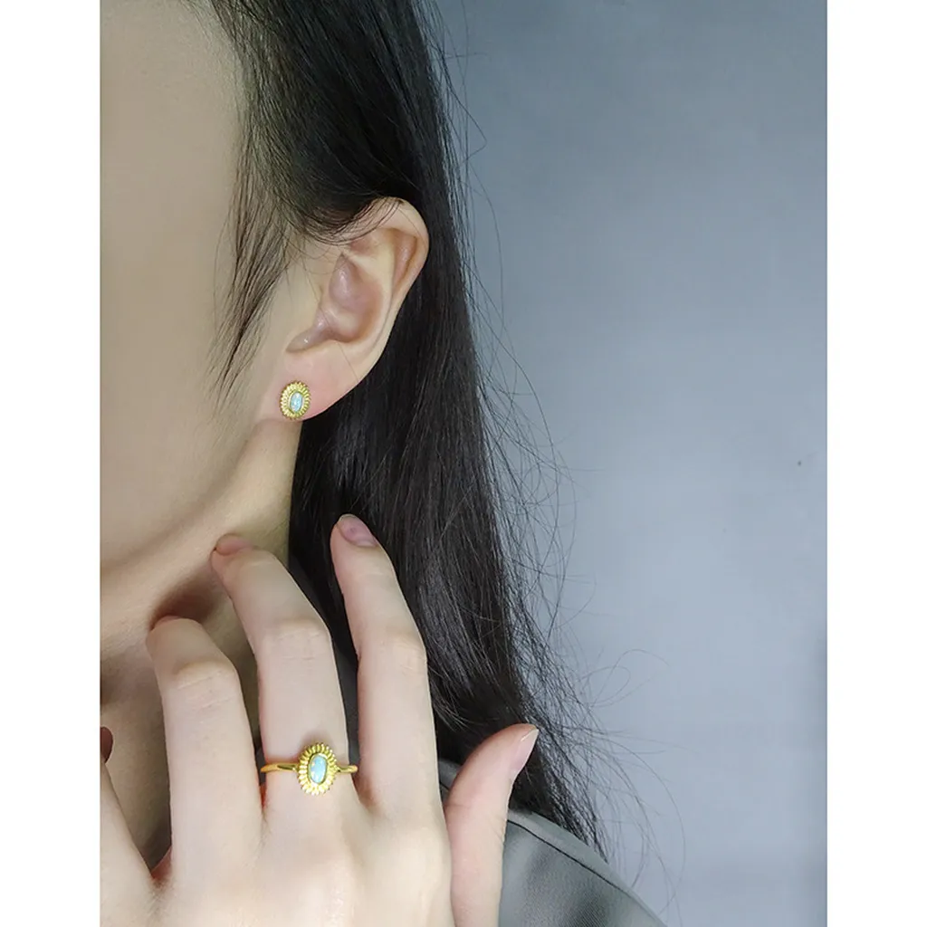 • Color: Luminous opals in iridescent pale blue and green tones, set in warm gold.
