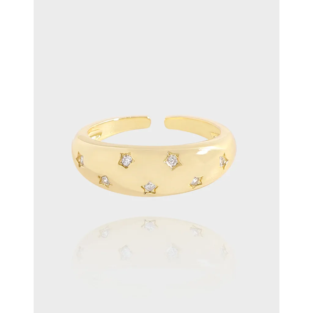 Embrace the celestial beauty with this captivating gold ring, designed to reflect the enchanting glimmer of the night sky. Its sleek, adjustable band offers both comfort and a touch of cosmic elegance.