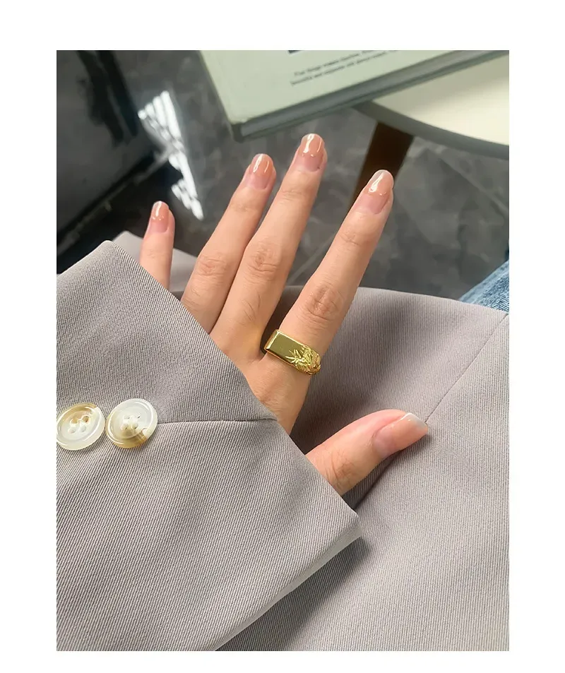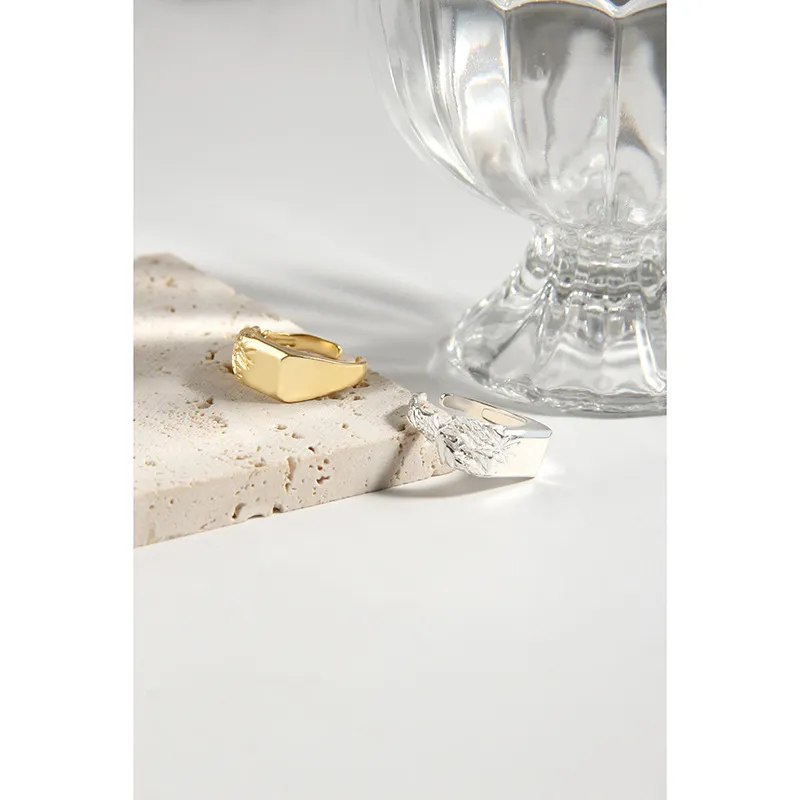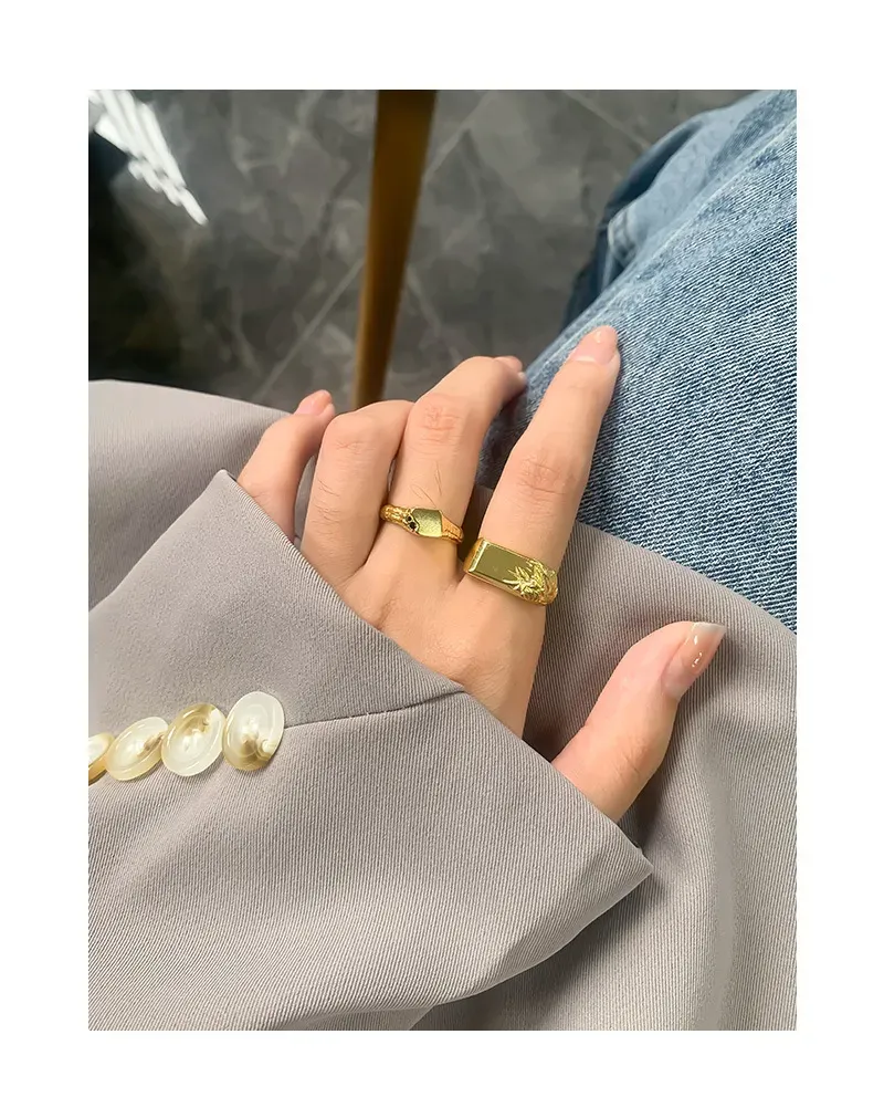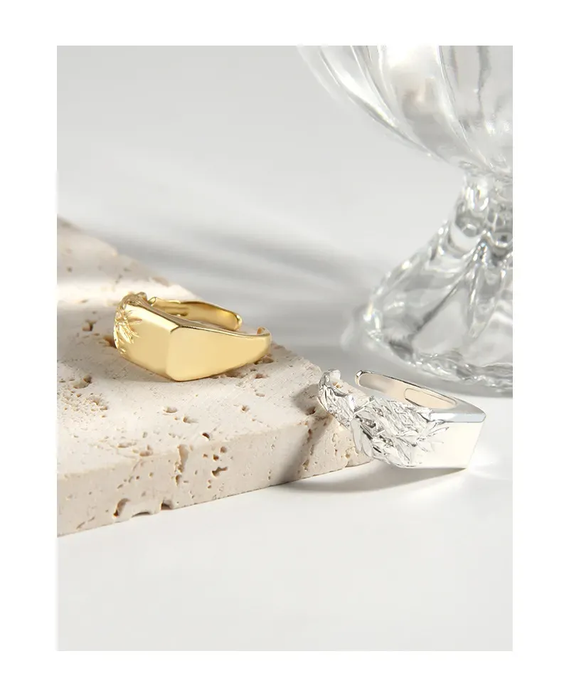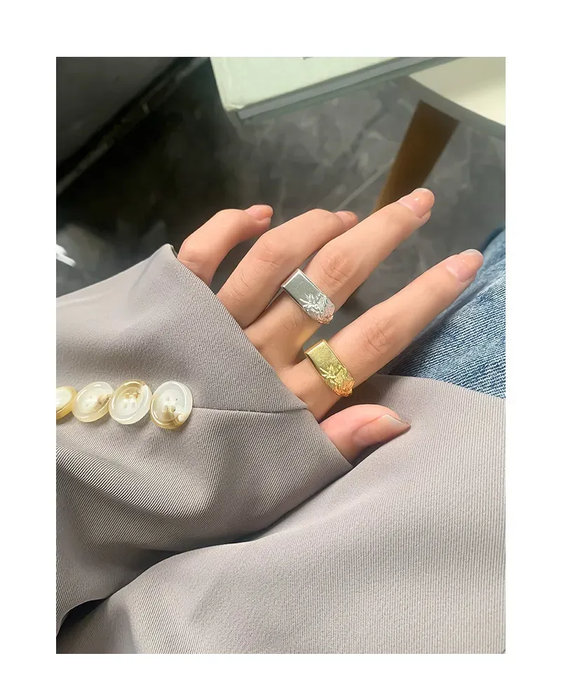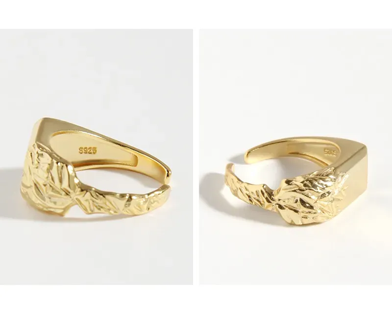 The Arajuka Ring’s distinctive style features a bold, polished rectangular side that transitions seamlessly into an intricately textured surface. This contrasting side is adorned with a rich, raw, and fluid pattern, evoking the delicate beauty of natural foliage or earthy formations. The interplay of smooth, reflective gold and deeply textured details creates a captivating visual and tactile experience, reflecting the brand’s celebration of nature’s imperfect beauty and celestial inspiration.