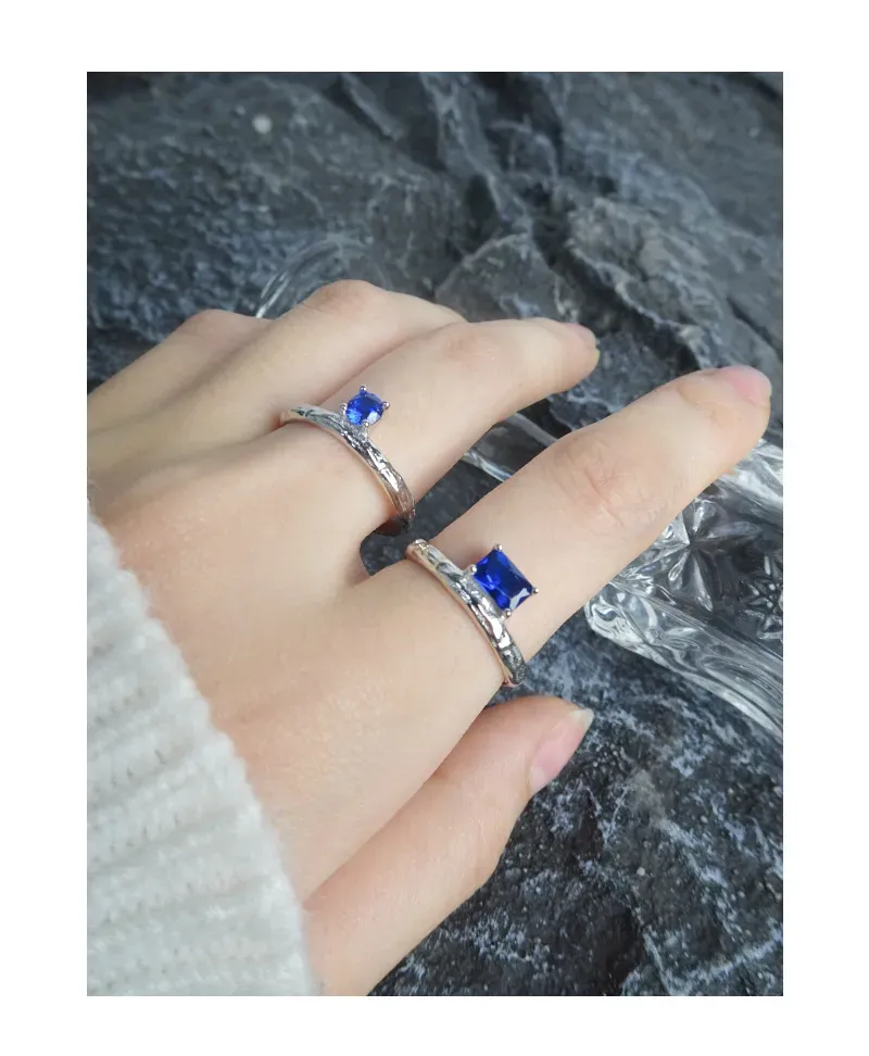 - Color: The Aralith Ring showcases a vibrant, deep blue faceted gemstone, elegantly contrasted by the polished sheen of its silver-toned metal setting.