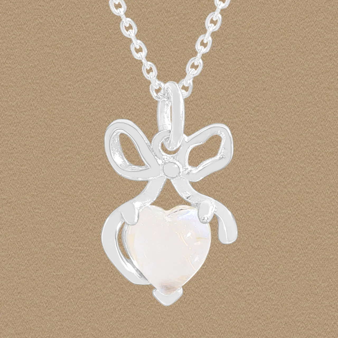 - Color: Crafted from lustrous silver, the delicate chain and intricately designed bow pendant exude a radiant glow. At its heart, an iridescent gem in a shimmering white hue captures the ethereal glow of the northern lights, echoing celestial beauty.