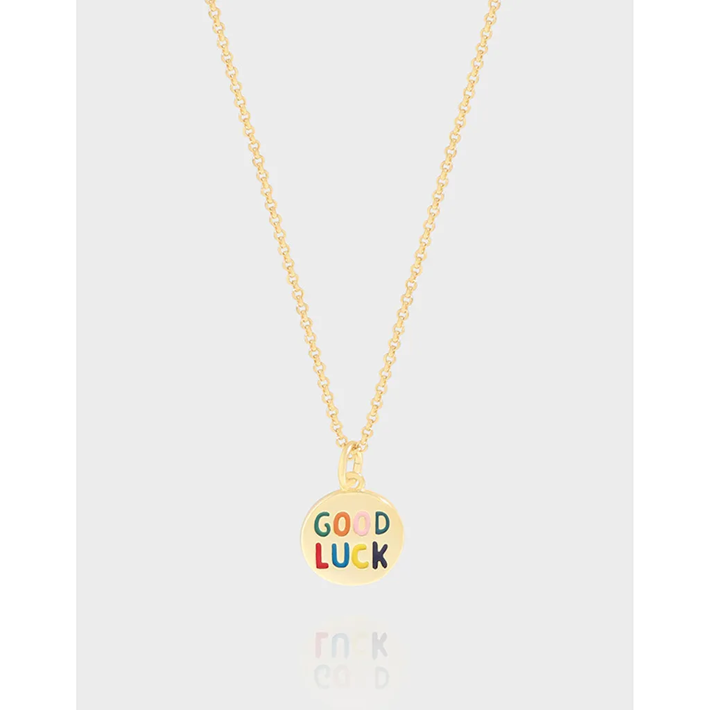 Patterns or Textures: The smooth, reflective surface of the gold disc pendant provides a striking contrast to the vibrant, block-lettered “GOOD LUCK” text. It is gracefully suspended from a fine cable chain, distinguished by its delicate, evenly spaced oval links that catch the light beautifully.