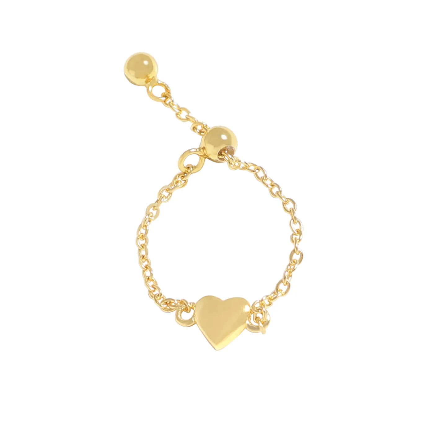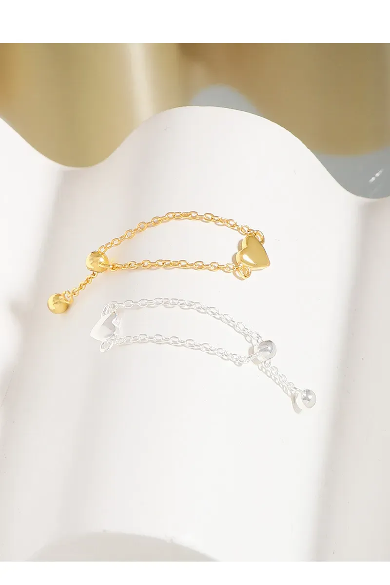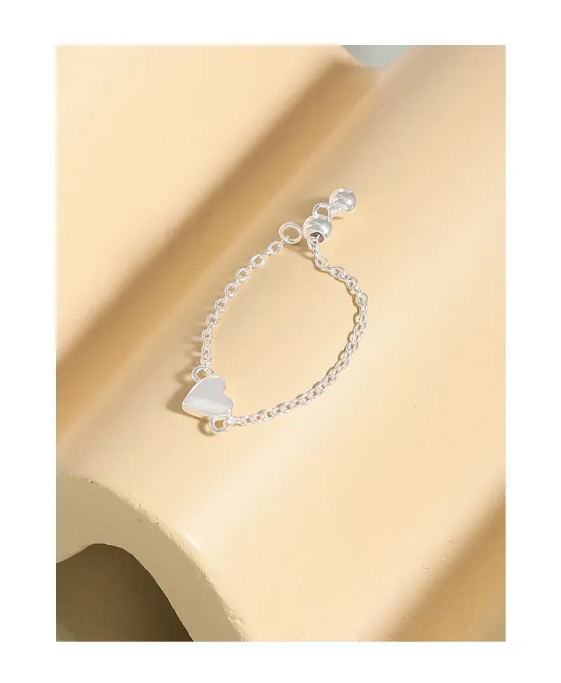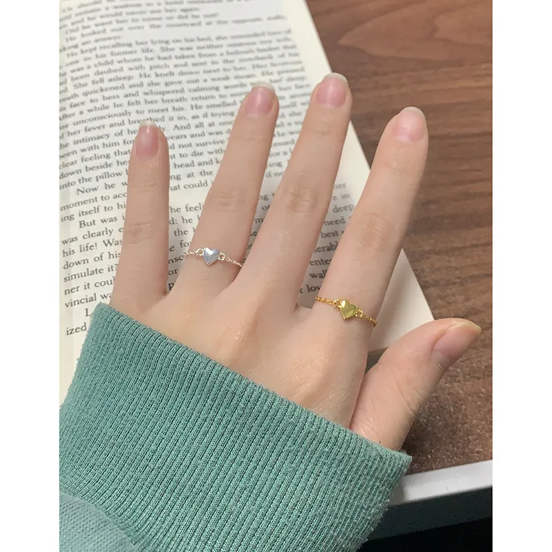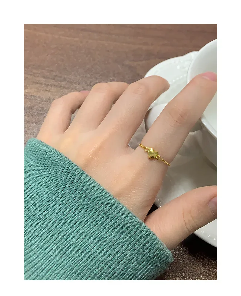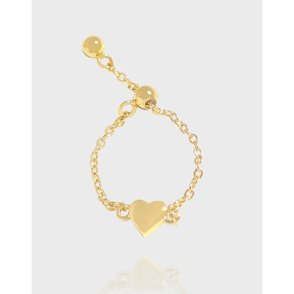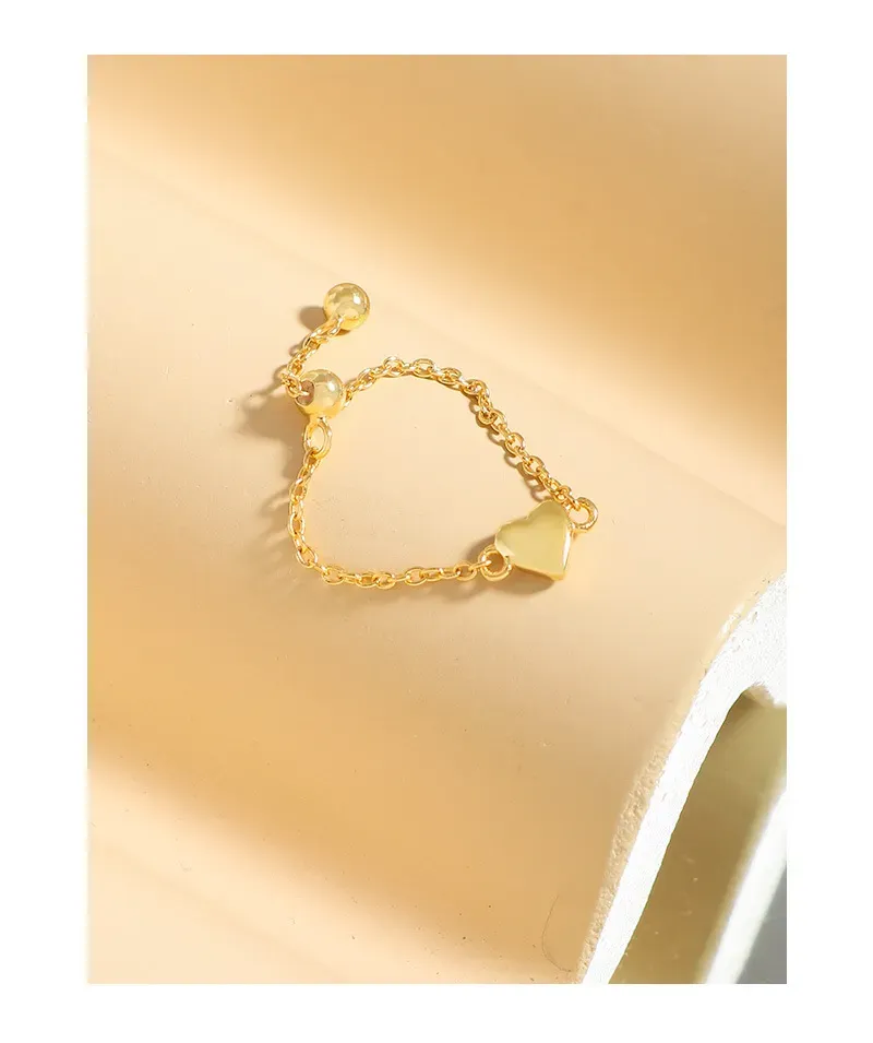 - Style: A gracefully designed chain ring featuring a central, perfectly formed heart charm. Its adaptable design incorporates two smooth, spherical stoppers that slide along the delicate chain, ensuring a perfect and secure fit for any finger. This piece embodies a minimalist yet romantic aesthetic, ideal for layering or solo wear.