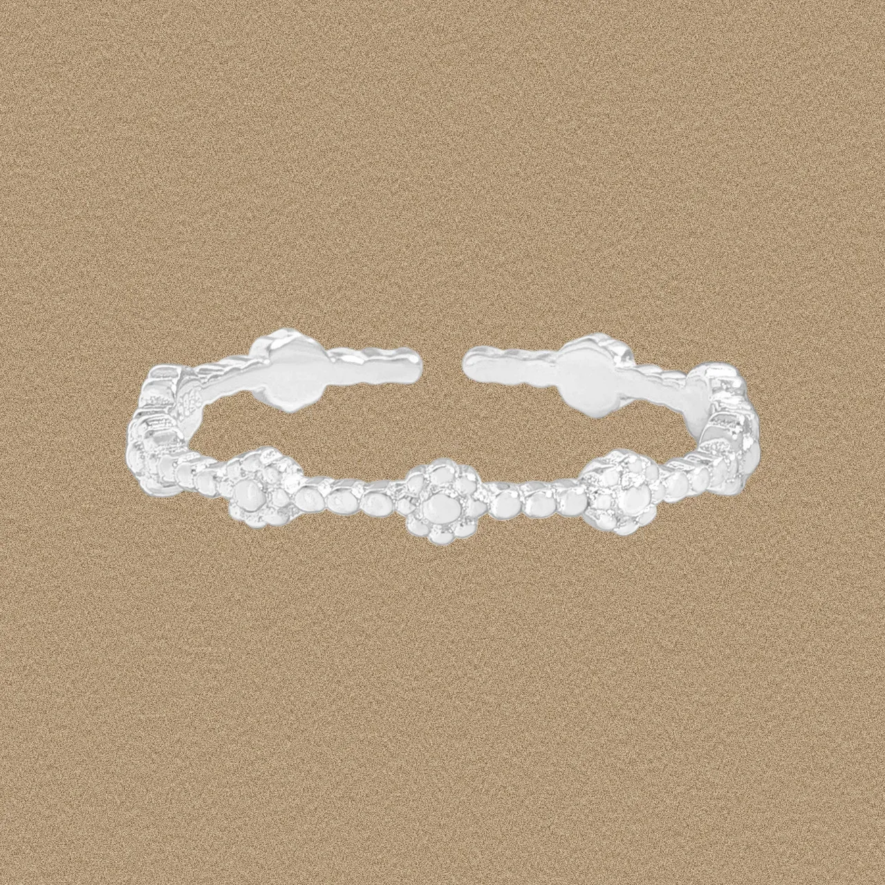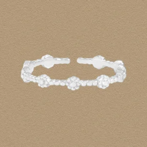 - Patterns & Textures: The band features a subtly textured surface, reminiscent of a delicate vine or organic growth. Adorning the band are three beautifully detailed floral clusters, each intricately formed from an array of tiny, rounded silver beads, evoking blooming petals. These clusters are thoughtfully interspersed with smaller individual beads, creating a rich, tactile texture and an imperfect, captivating pattern that celebrates nature’s artistry.