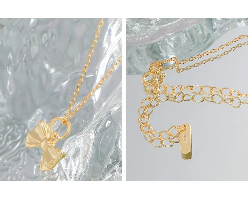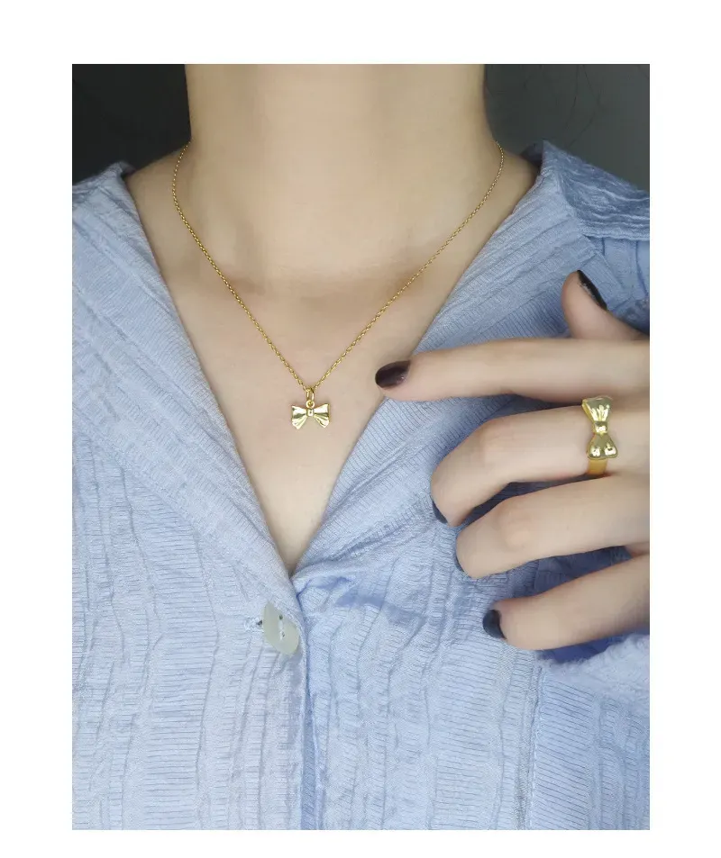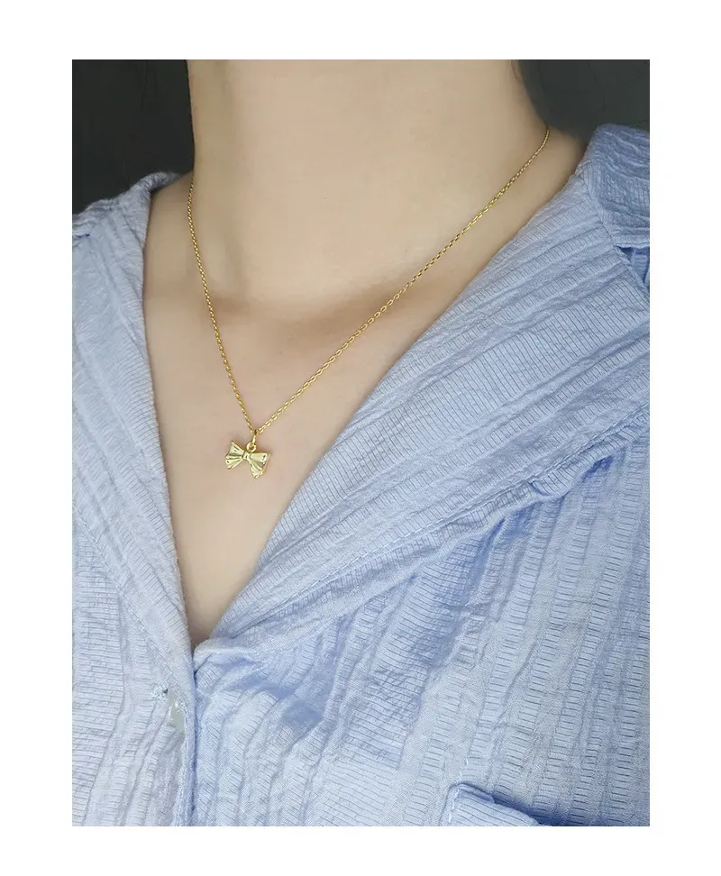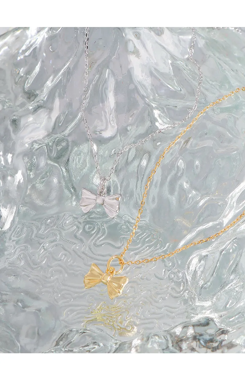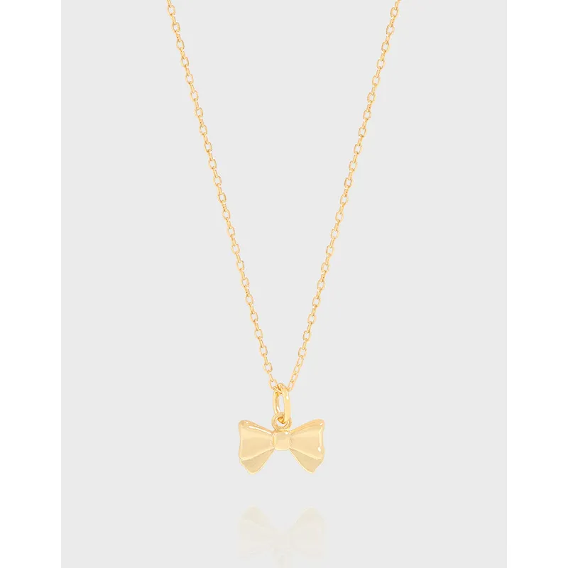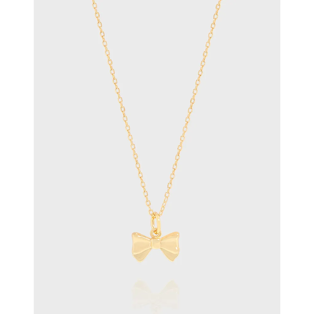 The bow pendant boasts a smooth, polished surface that beautifully reflects light, giving it a lustrous finish. The fine chain is composed of subtly interlinked elements, providing a delicate, organic texture to the piece.