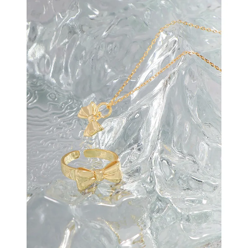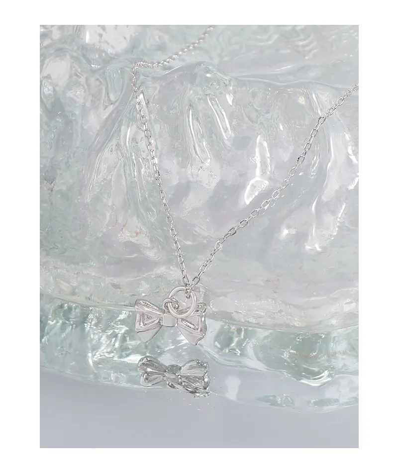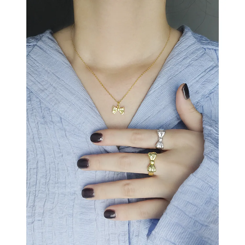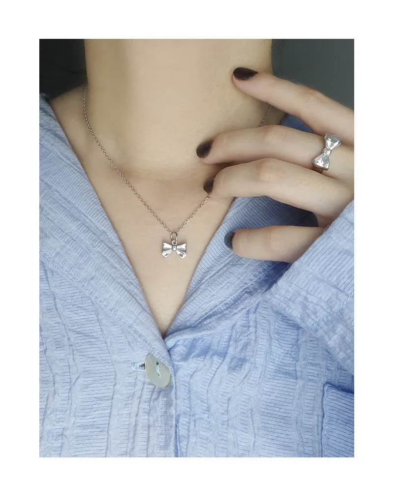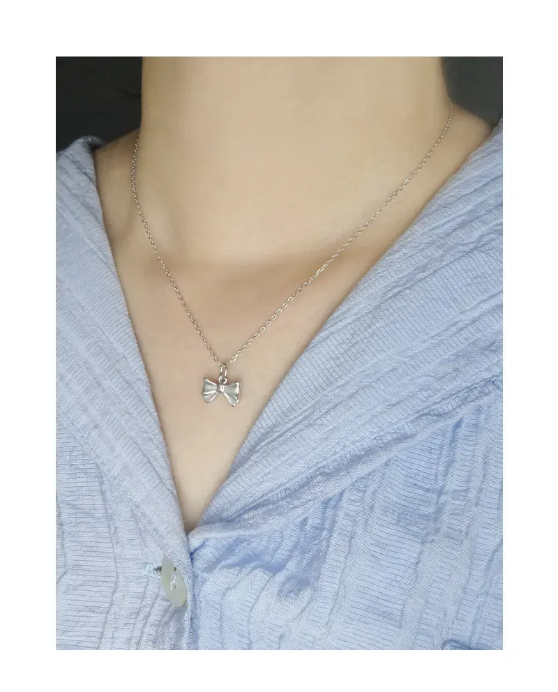 Its charming style features a dainty, fluid bow-shaped pendant, embodying a delicate balance of classic elegance and feminine grace. The timeless design offers a touch of whimsy.