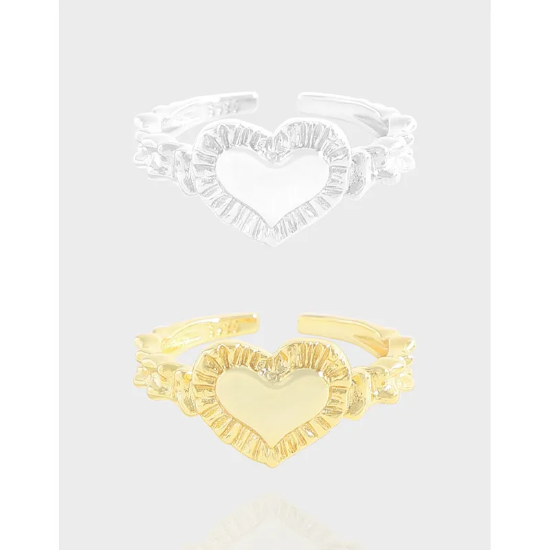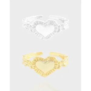 - Patterns or Textures: The prominent heart features a uniquely textured, ruffled edge, creating a delicate, sunburst-like pattern that beautifully catches the light. The ring’s band continues this artistic expression with its subtly irregular, raw texture, reflecting the imperfect and captivating beauty found in natural elements.