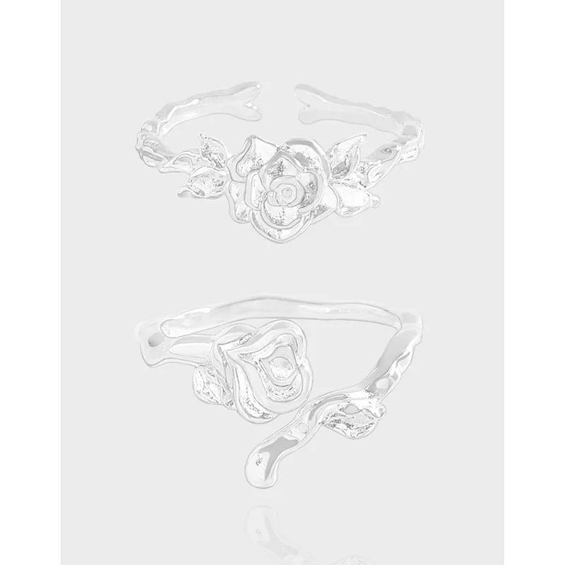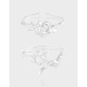 - Patterns & Textures: Each ring is sculpted with intricate rose patterns, depicting both full blooms and delicate buds, artfully integrated with textured vine-like bands. The metal showcases a fluid, organic texture, reminiscent of natural growth and subtle imperfections, celebrating the raw beauty found in nature’s forms.