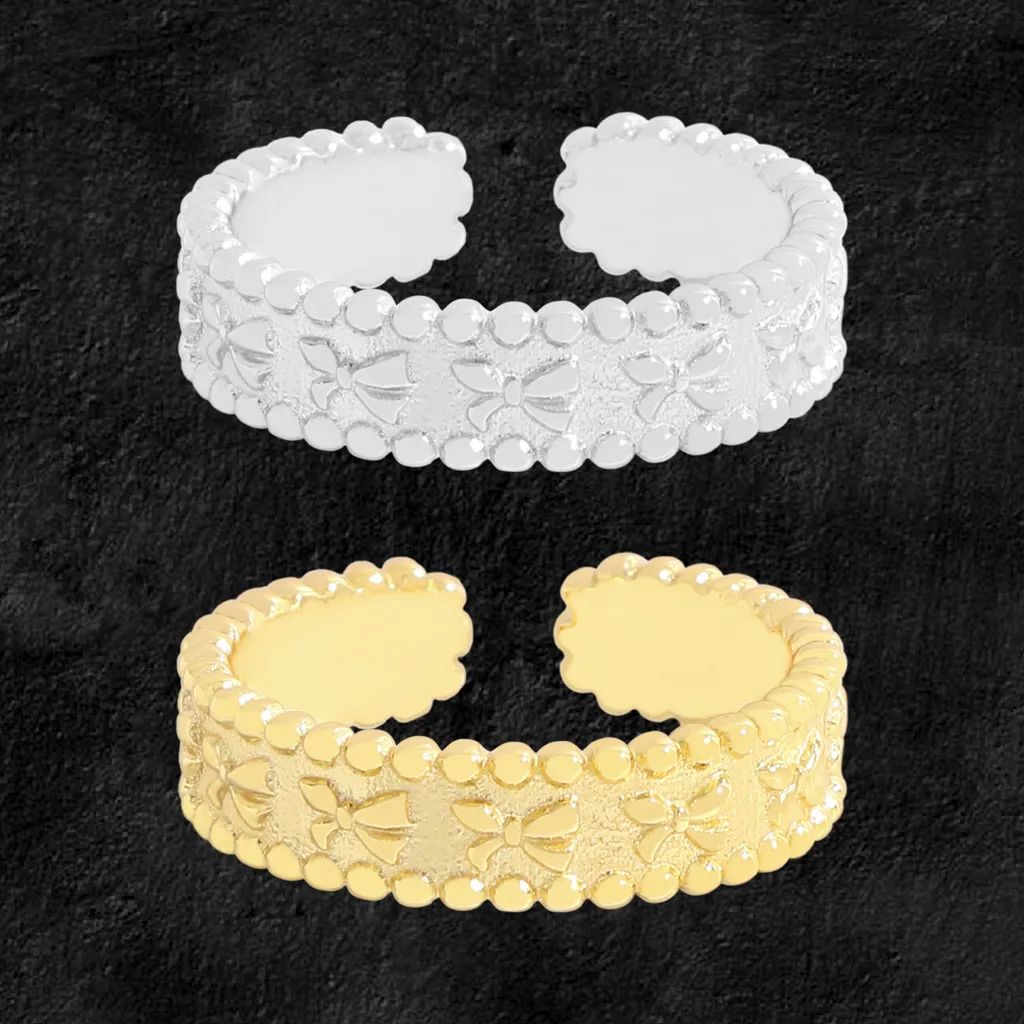 - Patterns & Textures: The ring features an exquisitely textured band adorned with delicate, repeating bow-like motifs, reminiscent of nature’s imperfect beauty. These charming patterns are elegantly framed by rows of intricately beaded edges, adding a tactile and organic dimension to the design.