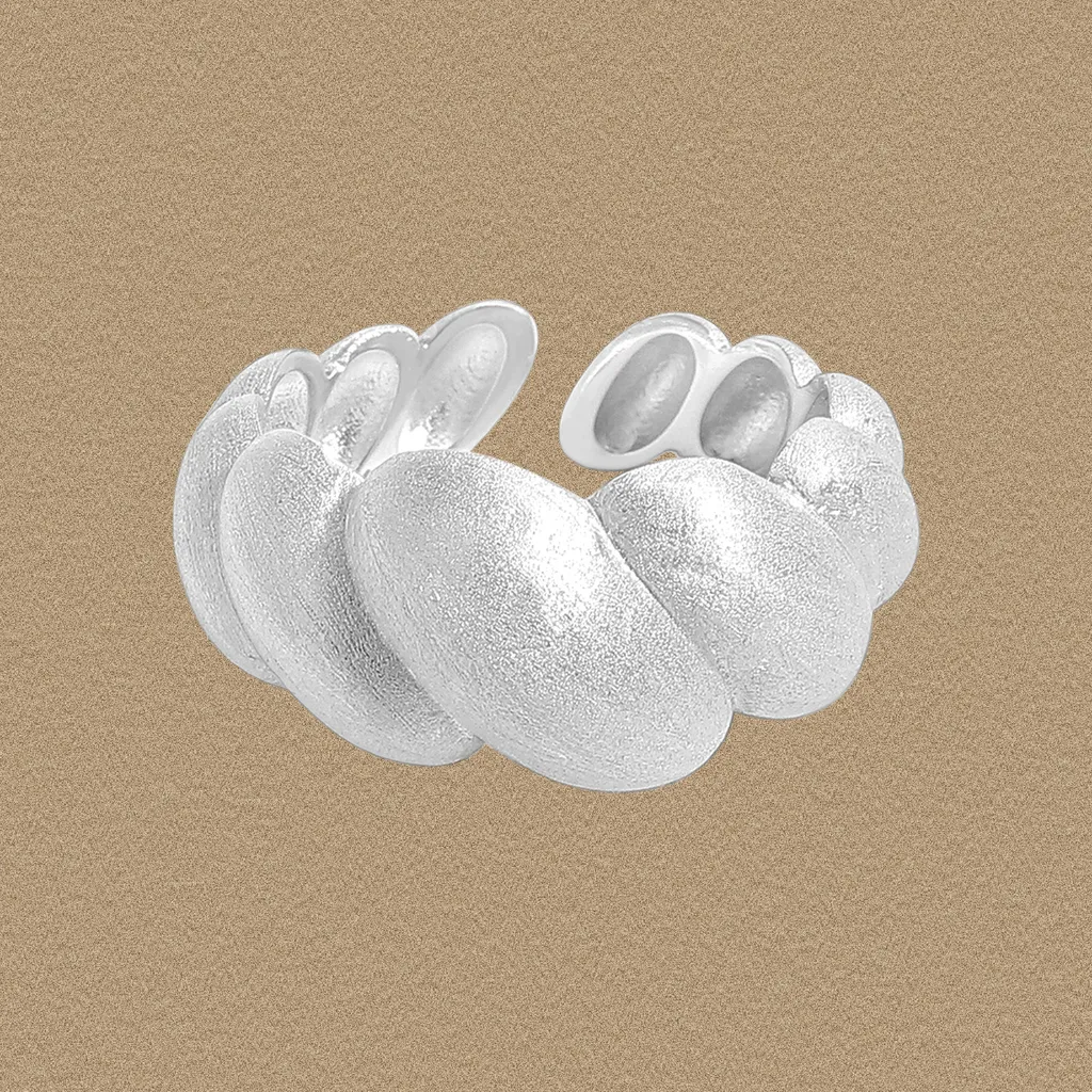 - Patterns & Textures: The surface boasts a finely textured, matte finish, lending a raw and authentic tactility. This contrasts subtly with the smoother, polished interior oval details at the ring’s open ends, adding depth and visual interest to its elegant, flowing pattern.