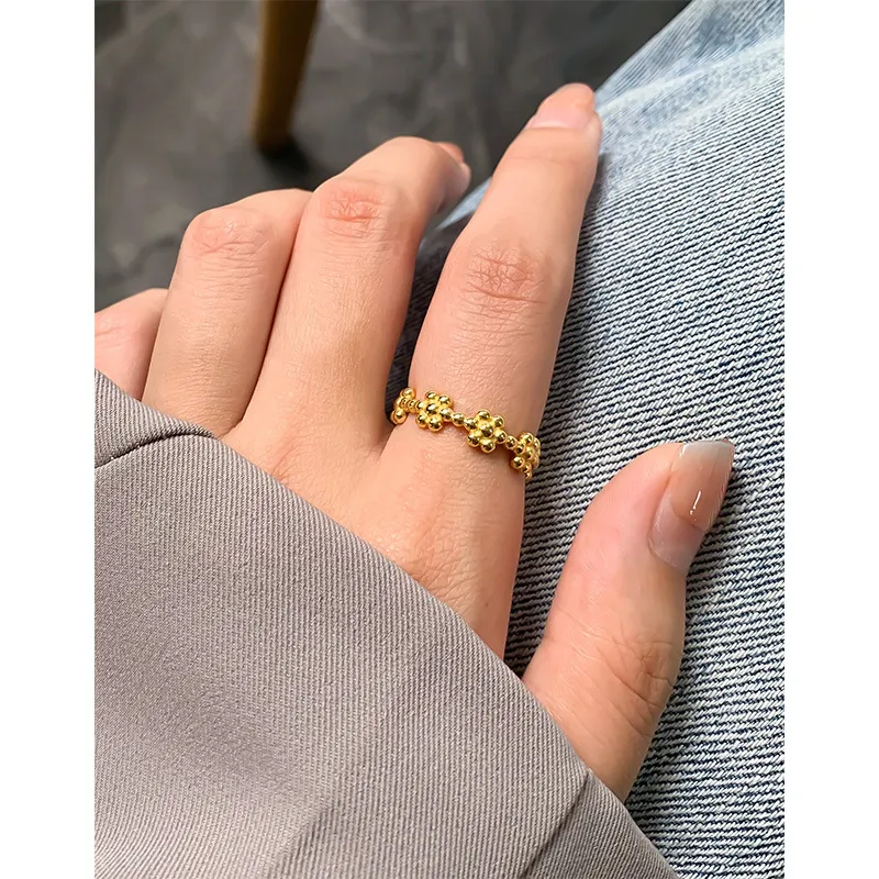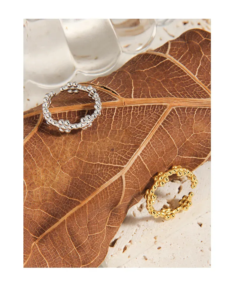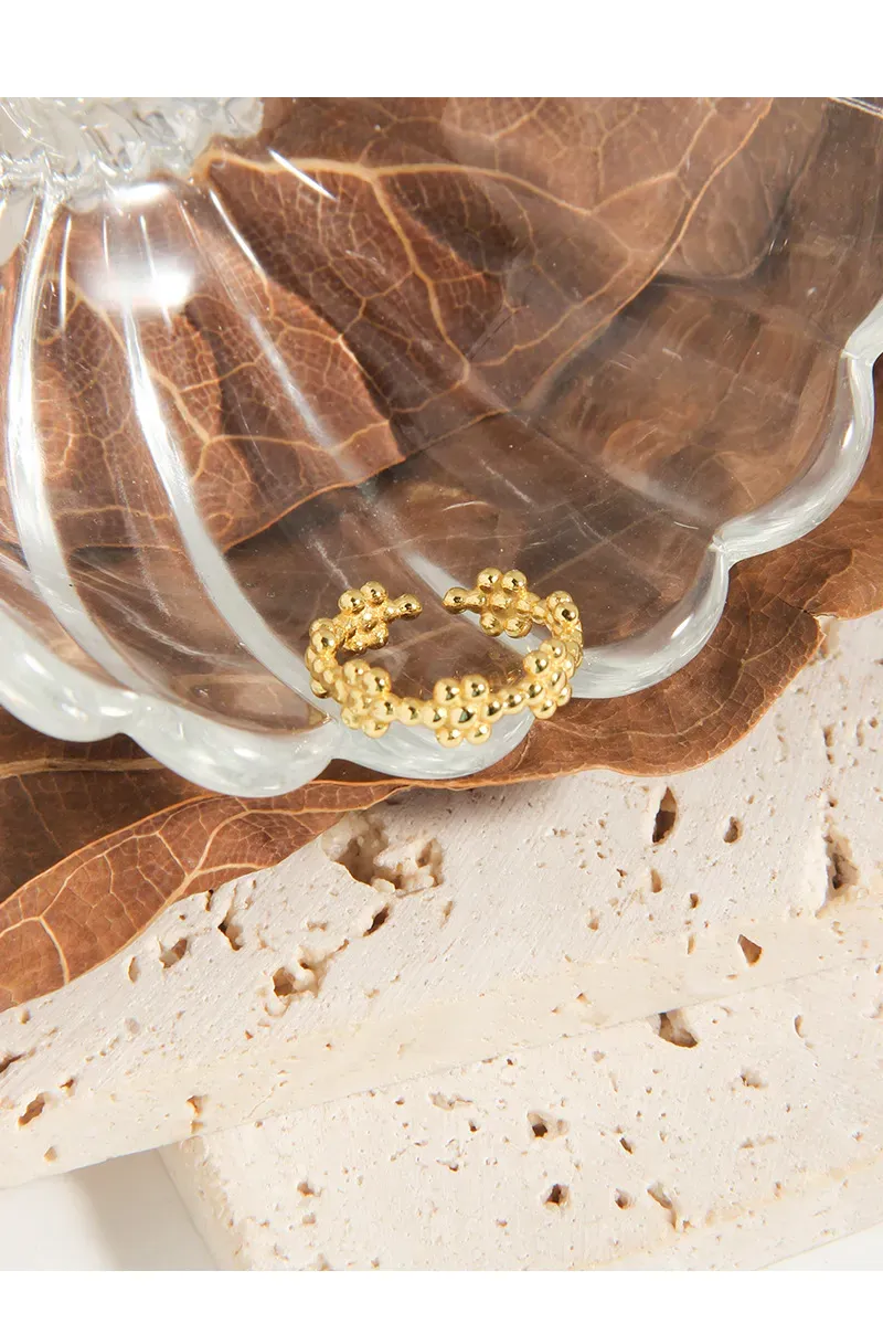 This captivating gold-toned ring beautifully marries delicate design with natural allure. Crafted in an open, adjustable style, it offers a comfortable fit for everyday wear.