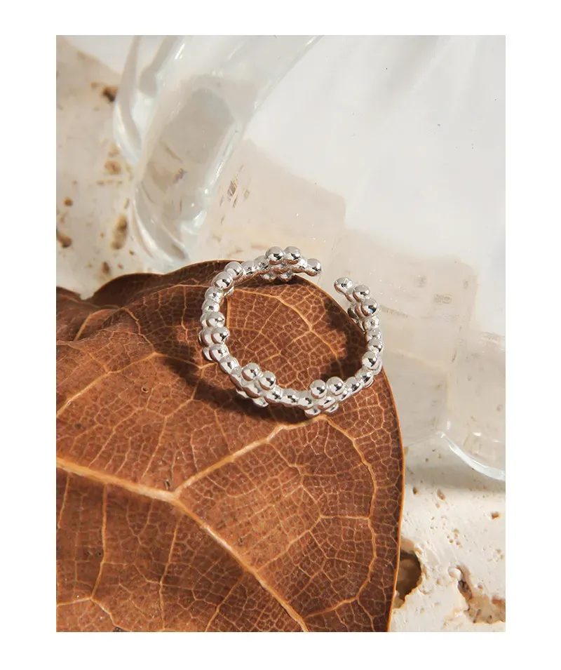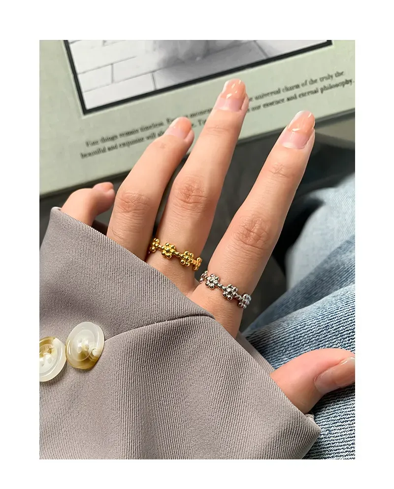 The Avonelle Ring’s distinctive pattern features a series of interconnected floral elements, each composed of finely detailed, rounded beads. These clusters create a charming and organic texture that flows gracefully around the finger.