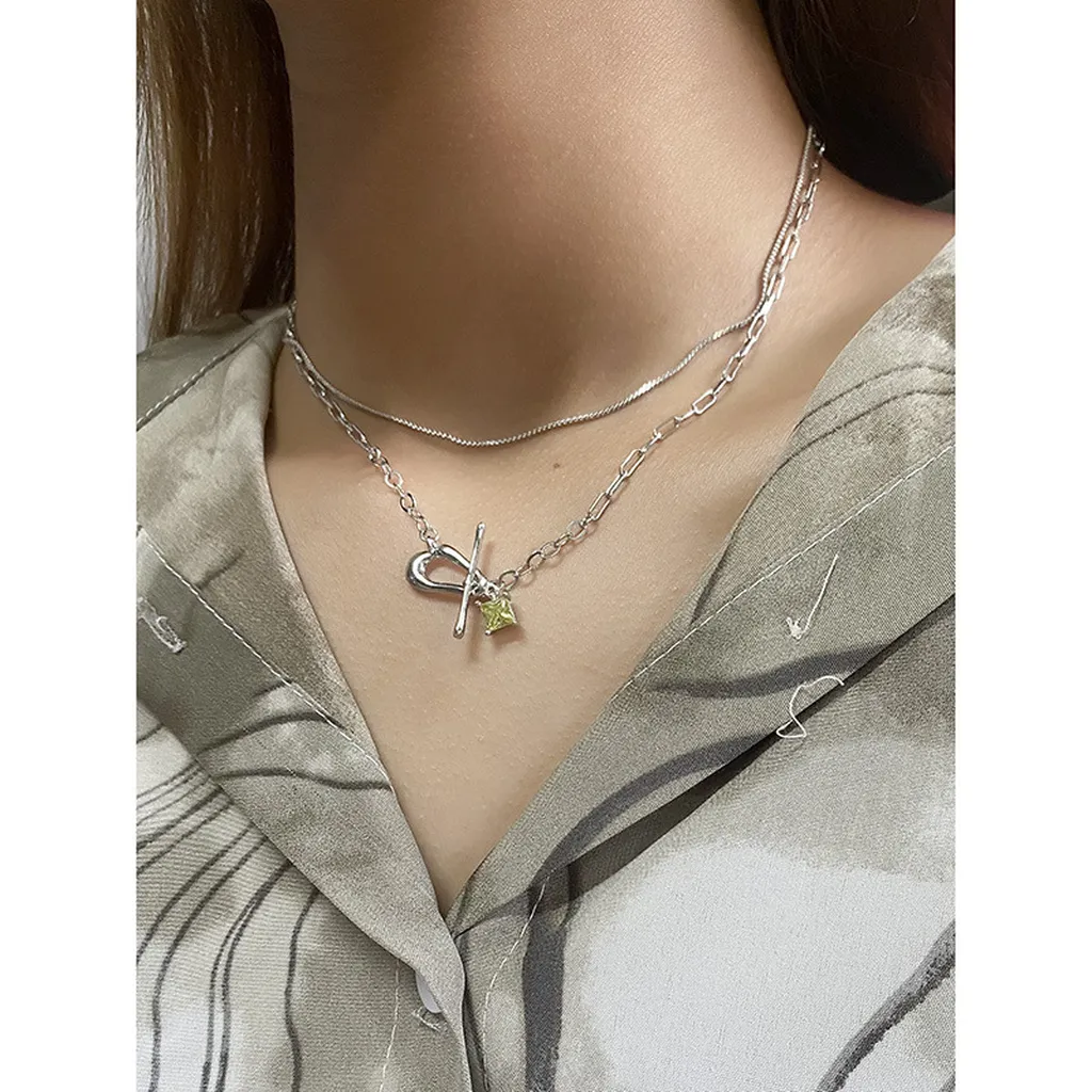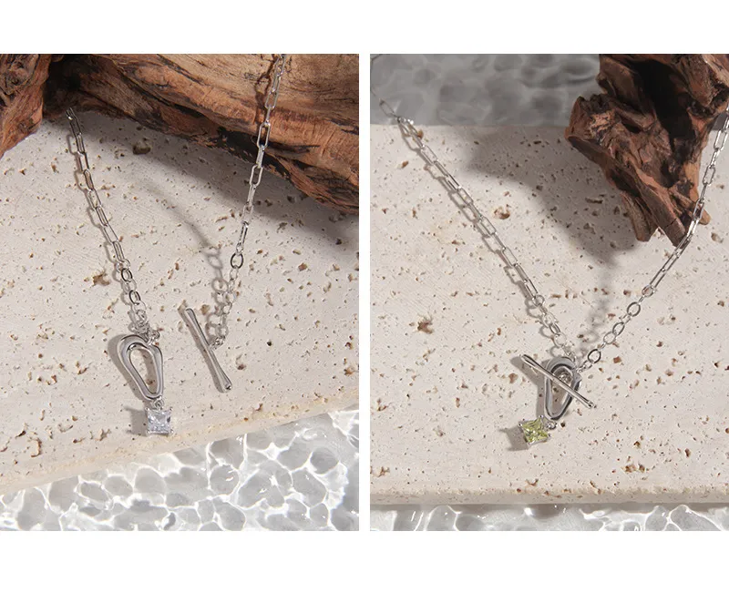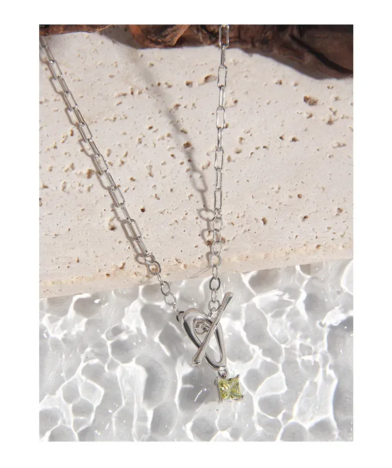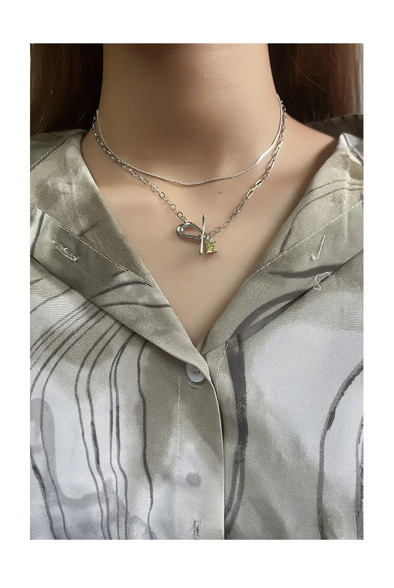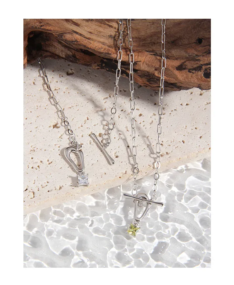 - Color: The Bania Necklace shines with a radiant, polished silver tone throughout its chain and distinctive toggle. Suspended below is a captivating square-cut gemstone, glowing in a vibrant, natural shade of zest green.