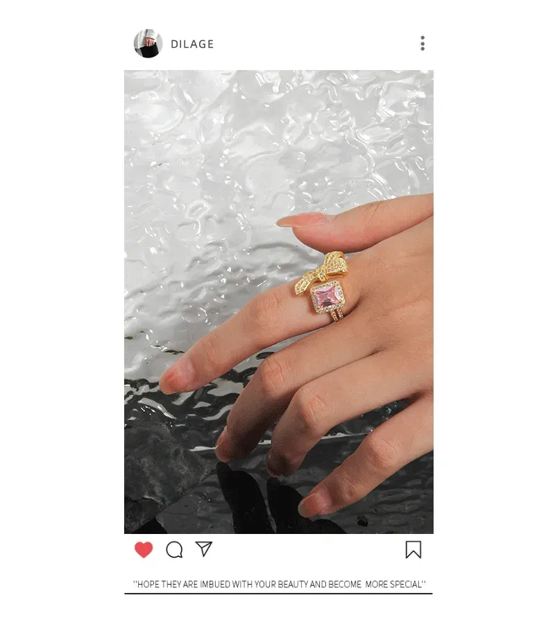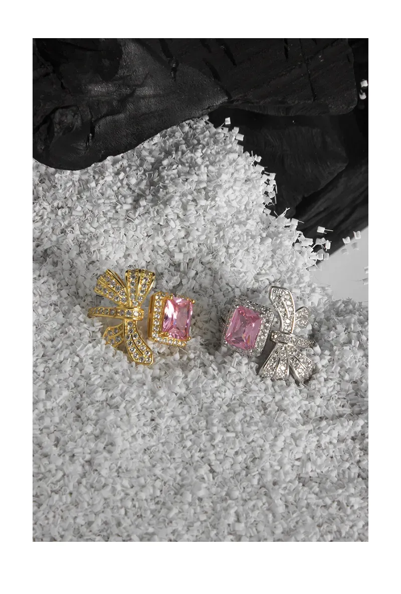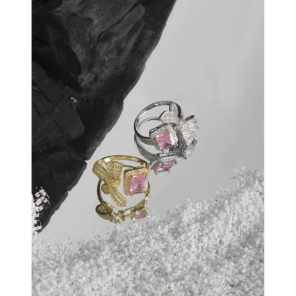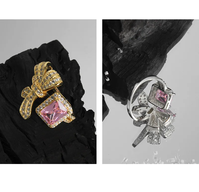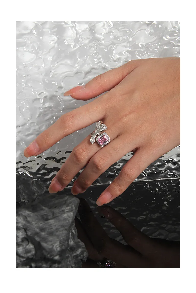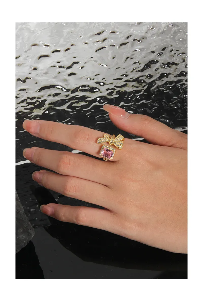 - Style: An elegant and whimsical open-style ring, presenting a graceful, sparkling bow on one side balanced by a prominent, dazzling rectangular gemstone on the other. Its design offers a sophisticated yet playful aesthetic.