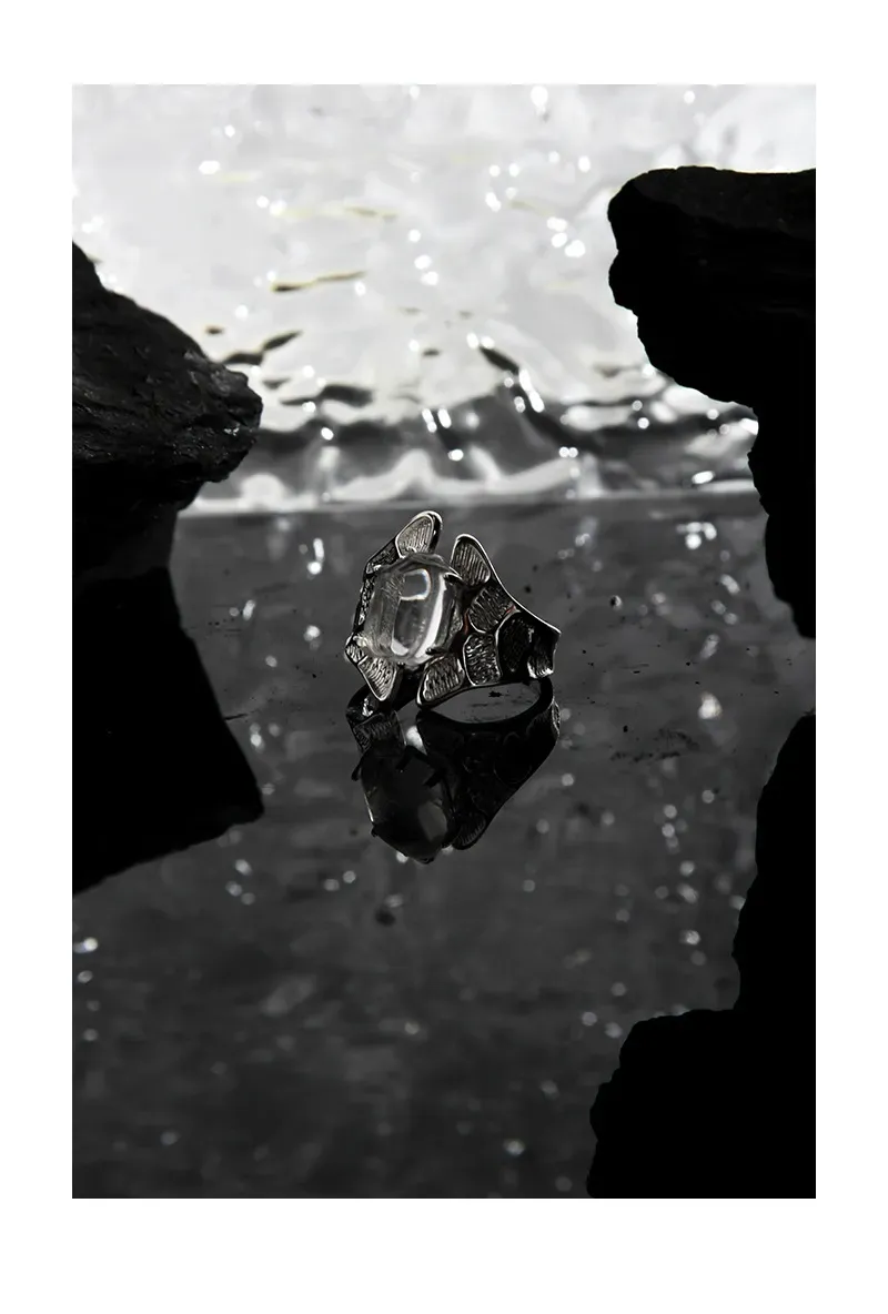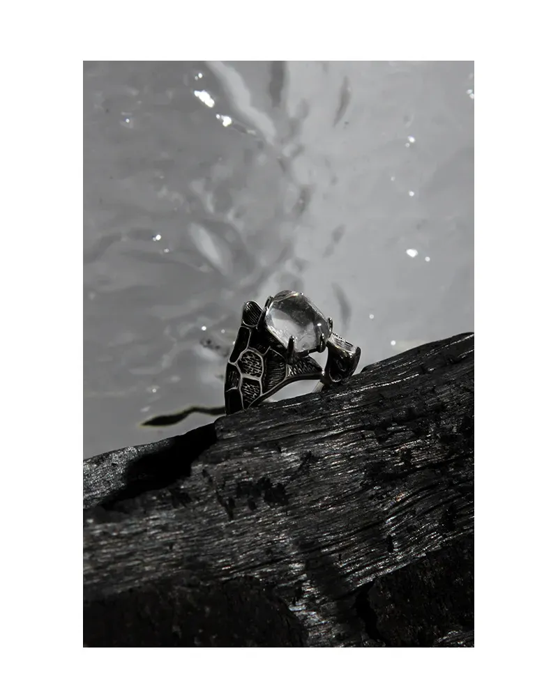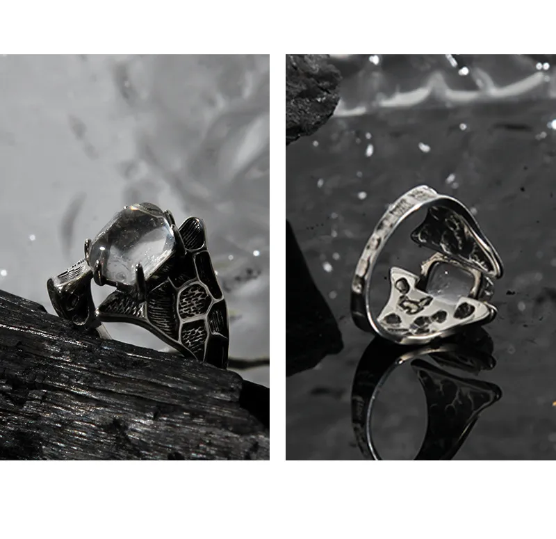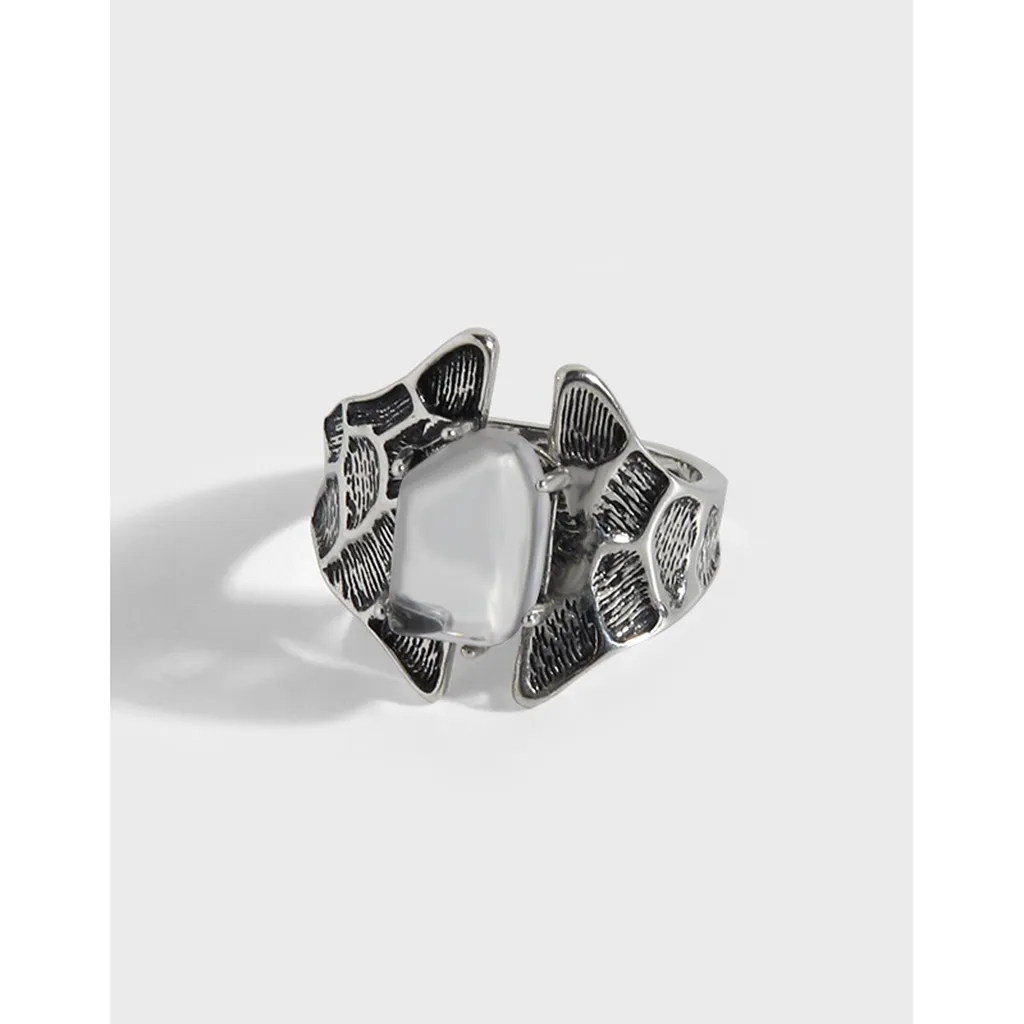 Discover a ring that captures the raw beauty and mystery of the natural world. This striking piece features an antiqued silver-tone finish, evoking the depth and character of aged elements found in nature.
