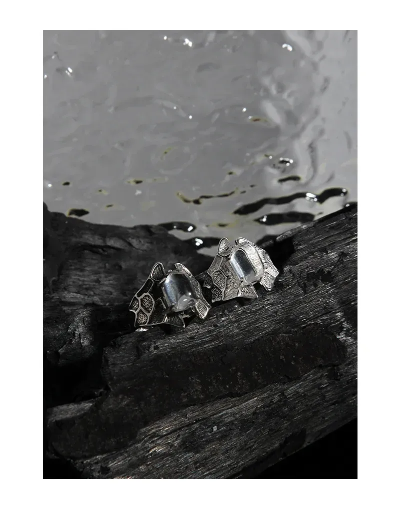 - Patterns or Textures: The metal parts flanking the stone are adorned with an intricate, rugged texture, reminiscent of cracked earth, tree bark, or geological formations, celebrating raw textures. This captivating pattern beautifully embraces the smooth, polished cabochon stone, creating a harmonious balance between refined and untamed elements.