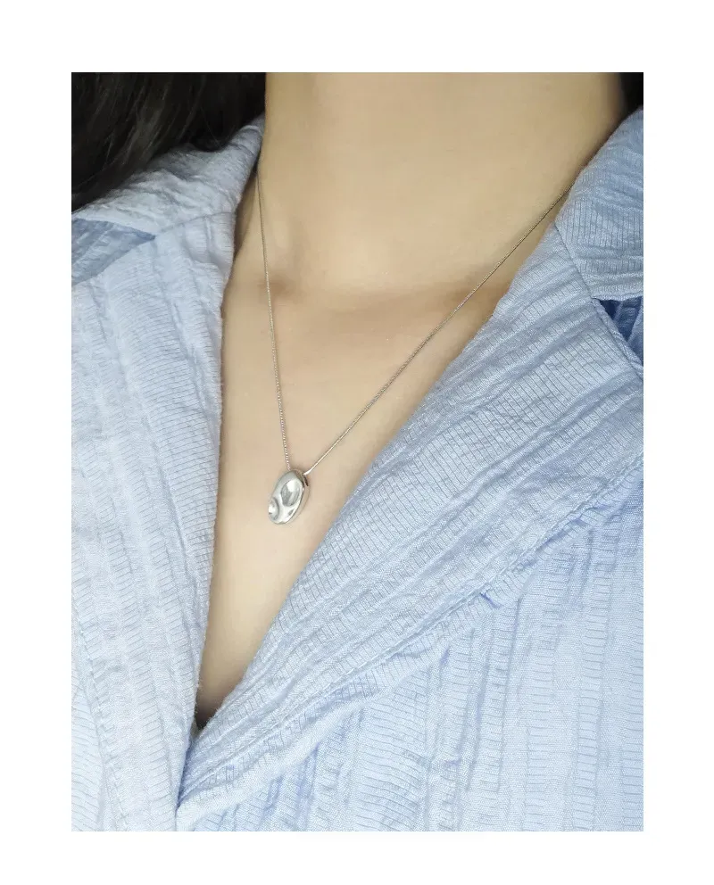 The centerpiece is an artfully designed pendant, featuring an abstract, fluid shape reminiscent of a perfectly polished river stone or molten metal. Its surface showcases unique, subtle patterns and textures, giving it a beautifully irregular, hammered-like appearance that catches and reflects light with every movement. This raw yet refined texture is a signature of Malisse, echoing the imperfect beauty found in nature’s patterns, much like the ever-changing brilliance of the aurora borealis.