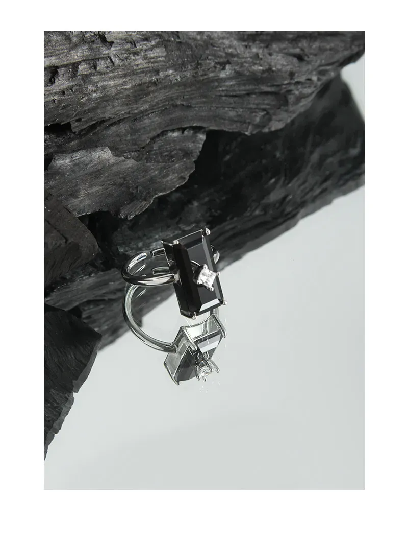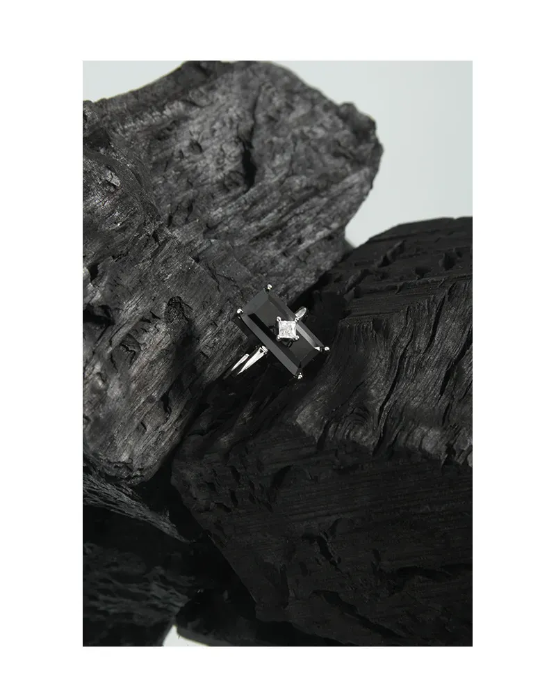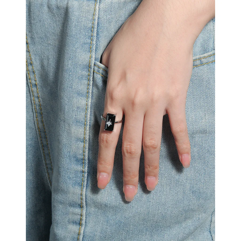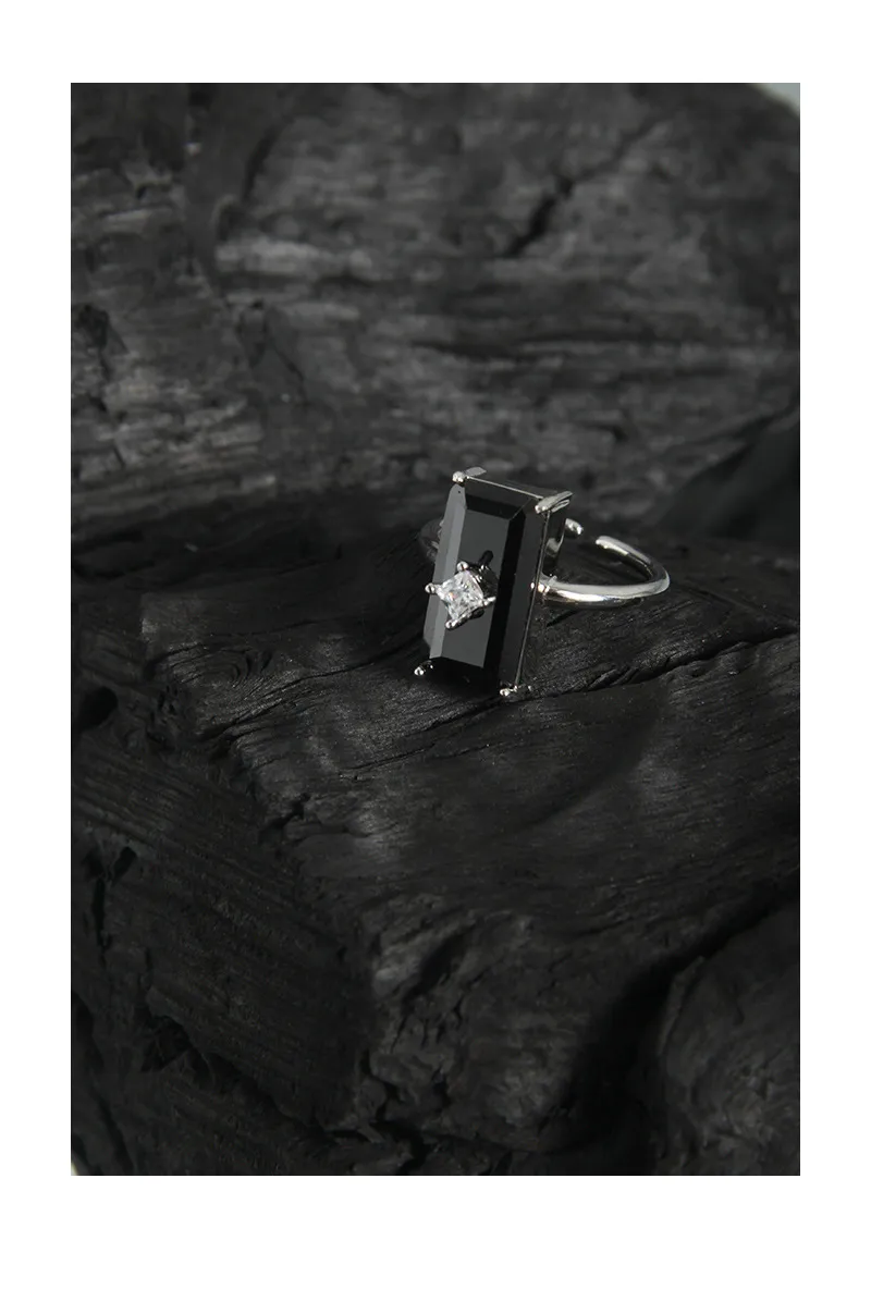 - Color: This Bexoria Ring features a striking, deep black rectangular gemstone, reminiscent of the boundless night sky. This dramatic hue is beautifully contrasted by a central brilliant, clear accent stone, mirroring a luminous star. The setting and band are crafted from polished, silvery metal, providing a sleek and modern foundation.