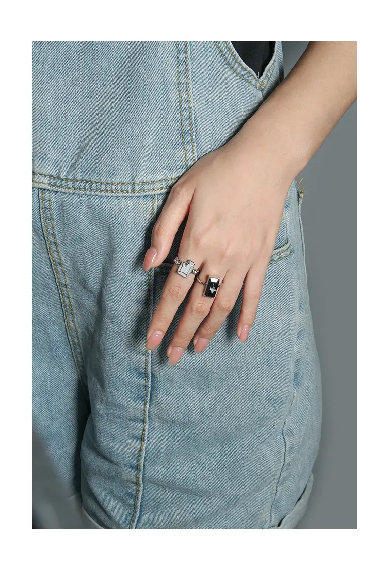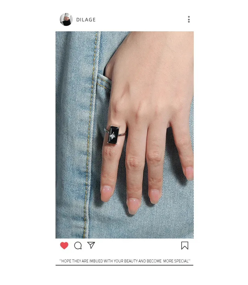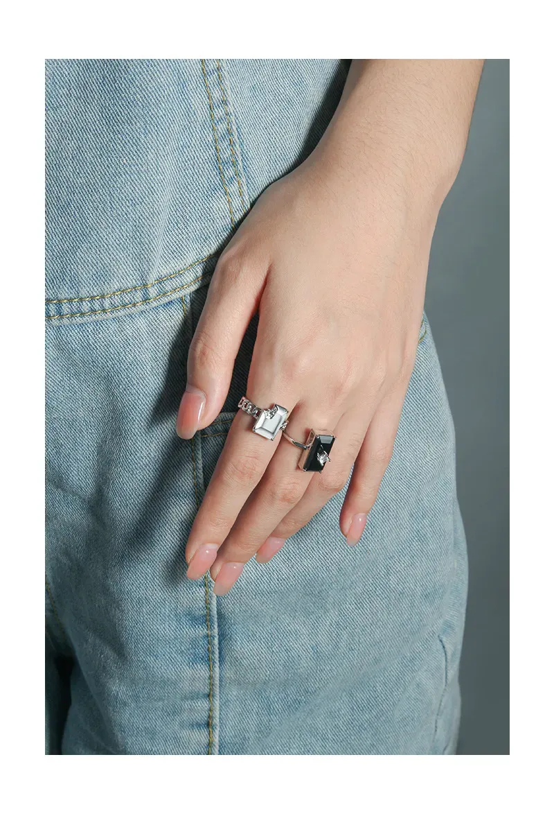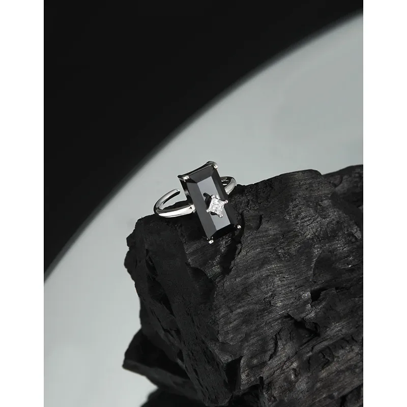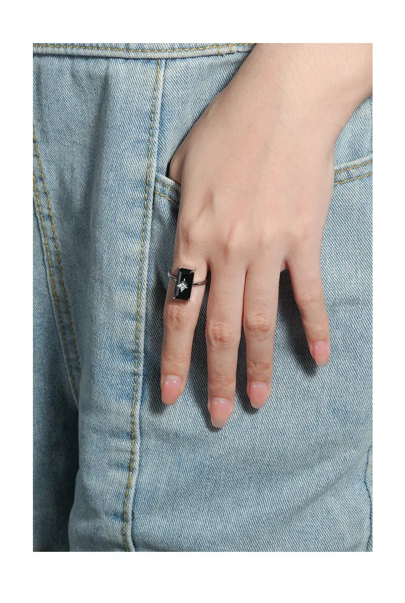 - Color: This Bexoria Ring features a striking, deep black rectangular gemstone, reminiscent of the boundless night sky. This dramatic hue is beautifully contrasted by a central brilliant, clear accent stone, mirroring a luminous star. The setting and band are crafted from polished, silvery metal, providing a sleek and modern foundation.