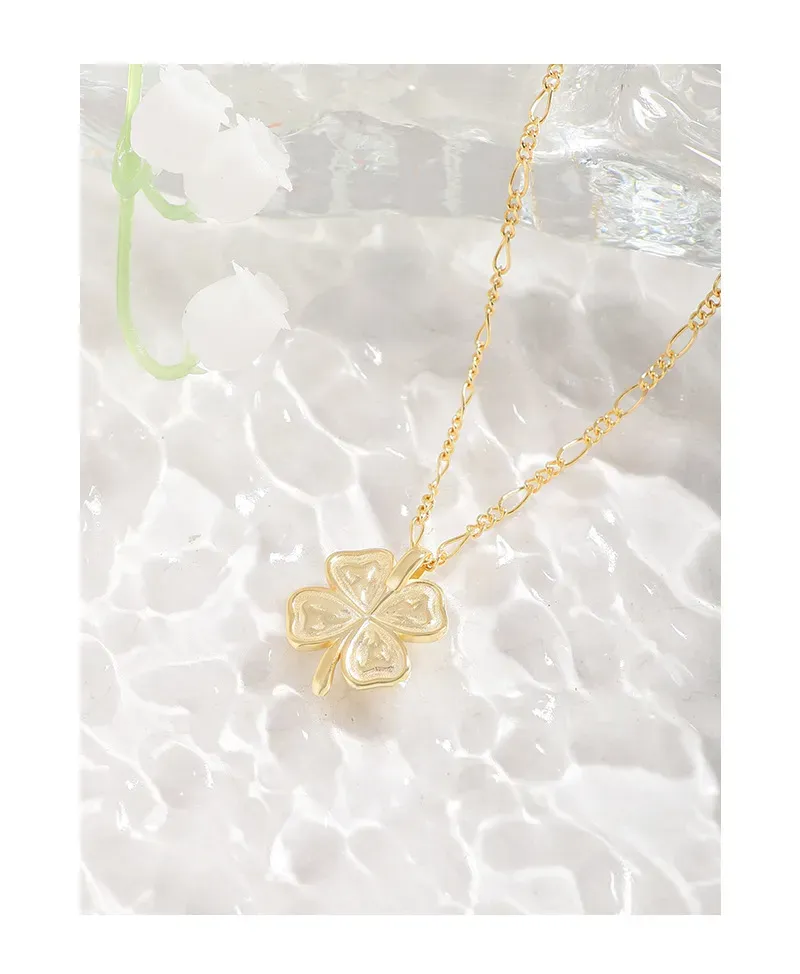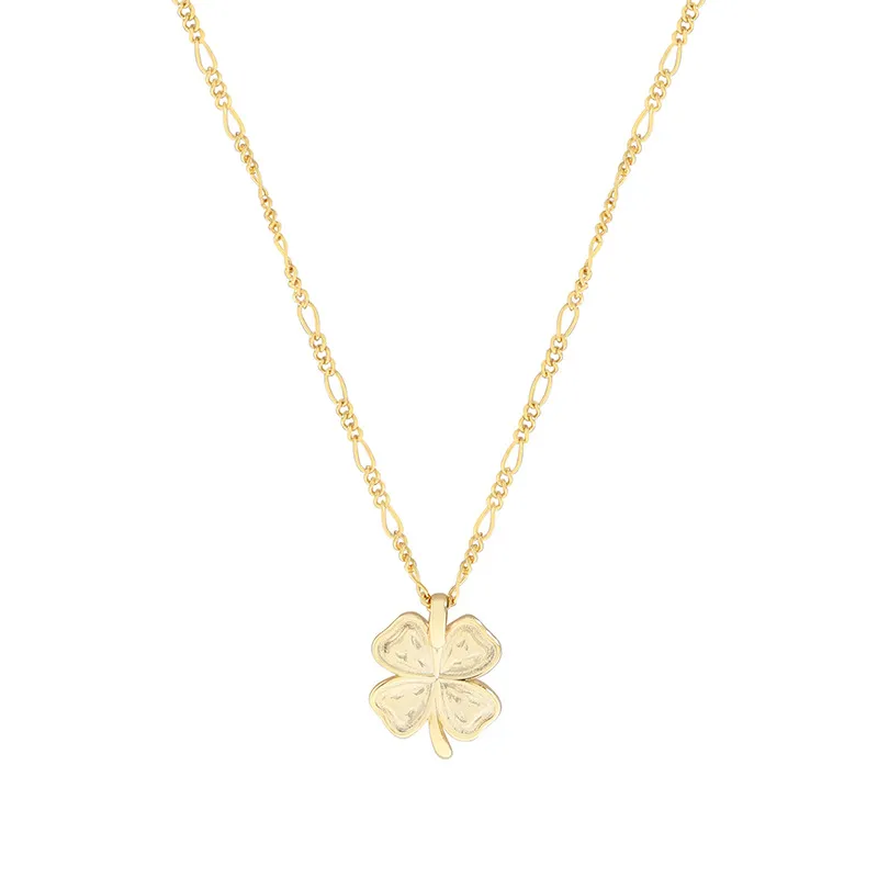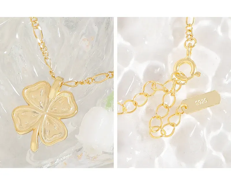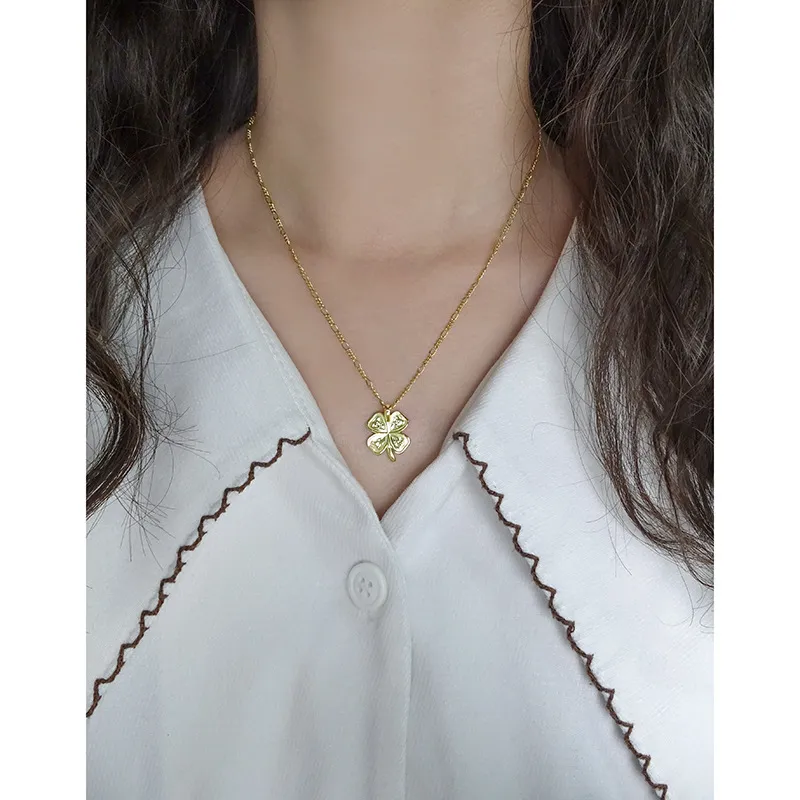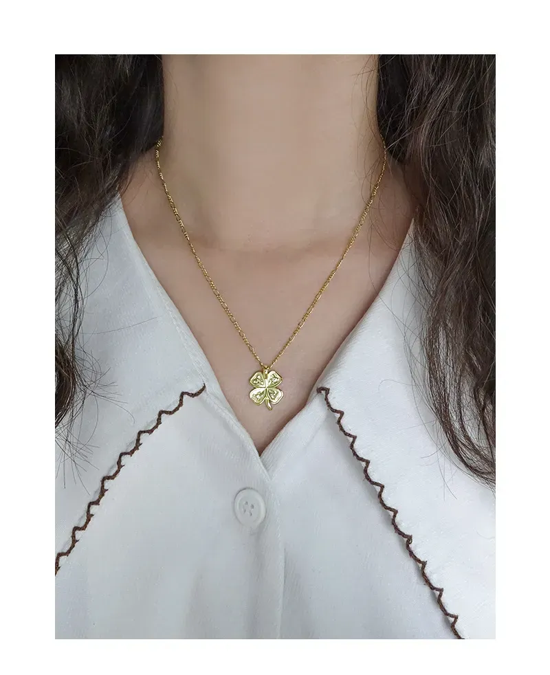 • Patterns & Textures: The delicate chain showcases a classic Figaro link pattern, creating a rhythmic flow of alternating elongated and rounded segments. The four-leaf clover pendant features smooth, polished surfaces with subtly defined contours for each leaf, celebrating the “imperfect beauty of nature’s patterns.”