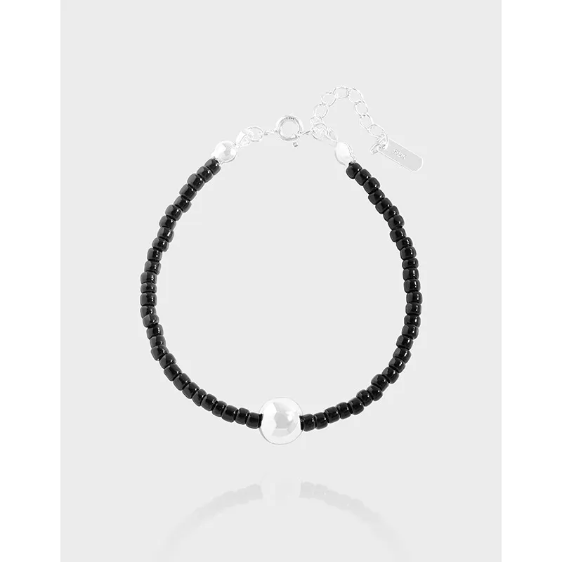 The Branda Bracelet features a mesmerizing strand of deep black beads, reminiscent of the profound depths of the night sky. At its heart lies a single, radiant white pearl, glowing with an ethereal luminescence like a captured moonbeam. Complemented by shimmering silver-toned clasps and an adjustable extension chain, the piece offers a harmonious contrast that is both sophisticated and captivating.