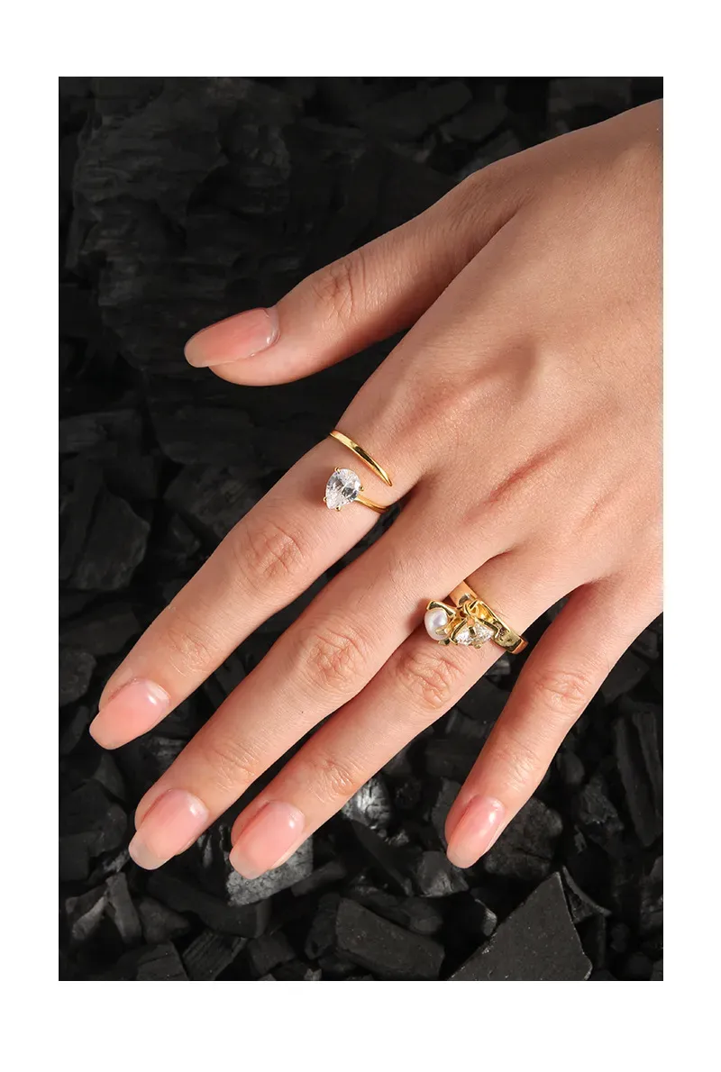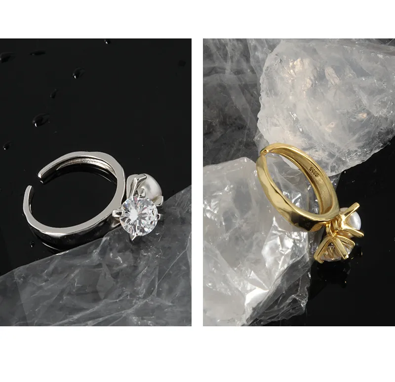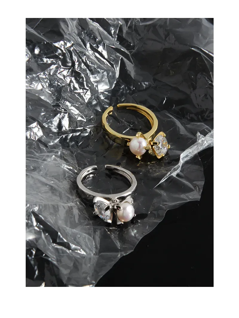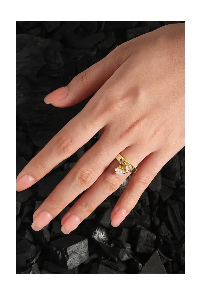 Color: Showcasing a rich gold-toned metal, the Brensalia Ring is adorned with a lustrous white pearl and a dazzling clear, brilliant-cut stone, reflecting a spectrum of light akin to the northern lights.