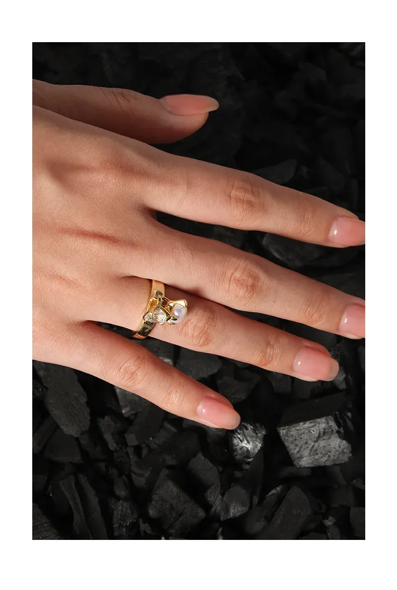 Patterns & Textures: The golden band features a distinctive, slightly organic and textured finish, reminiscent of natural formations and the imperfect beauty of the world around us. This raw texture beautifully contrasts with the smooth, pearlescent surface and the intricate facets of the sparkling clear gemstone.
