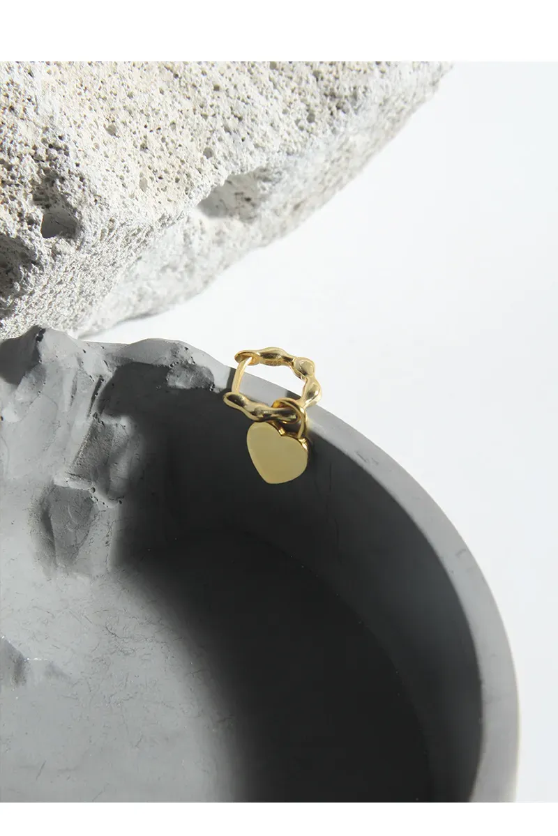This exquisite single earring embodies elegant simplicity and a connection to nature’s fluid forms. Crafted in a radiant gold hue, it features a unique organic-shaped hoop from which a smooth, polished heart charm gracefully dangles, creating a harmonious blend of raw texture and refined shine.