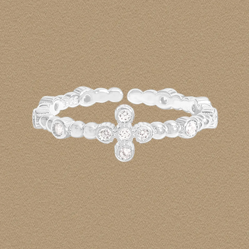 - Style: An open, adjustable band offers a versatile fit and a modern, airy aesthetic. Its delicate design, centered around a spiritual cross motif, makes it a timeless piece perfect for layering or as a singular statement, embodying the fluid and organic essence of our world.