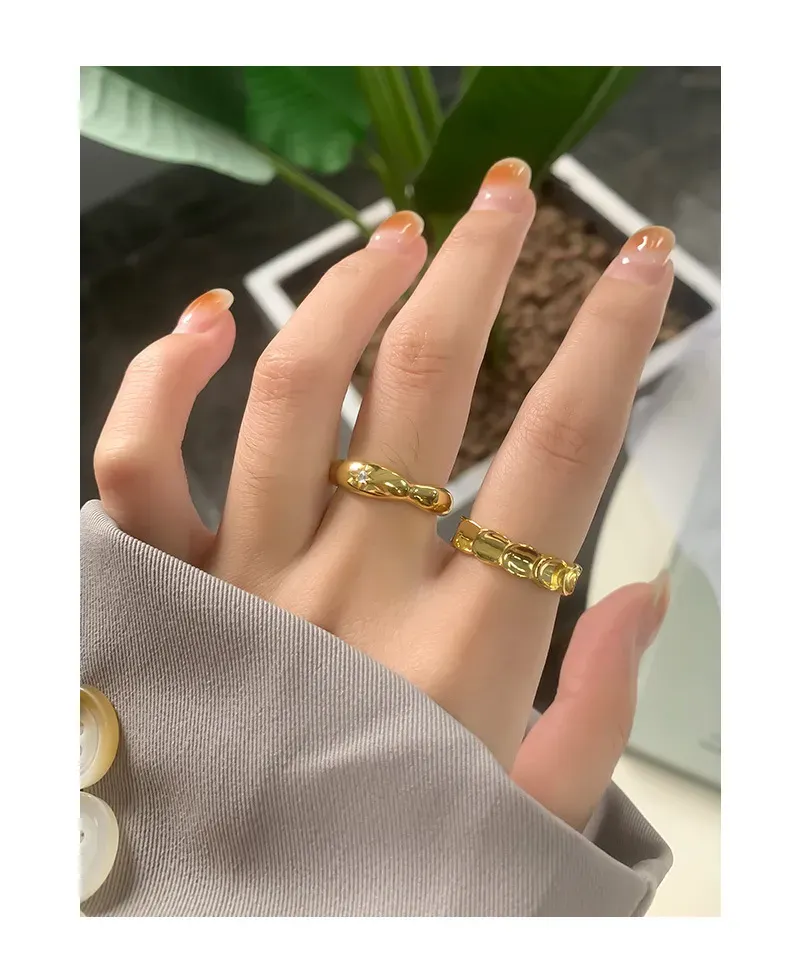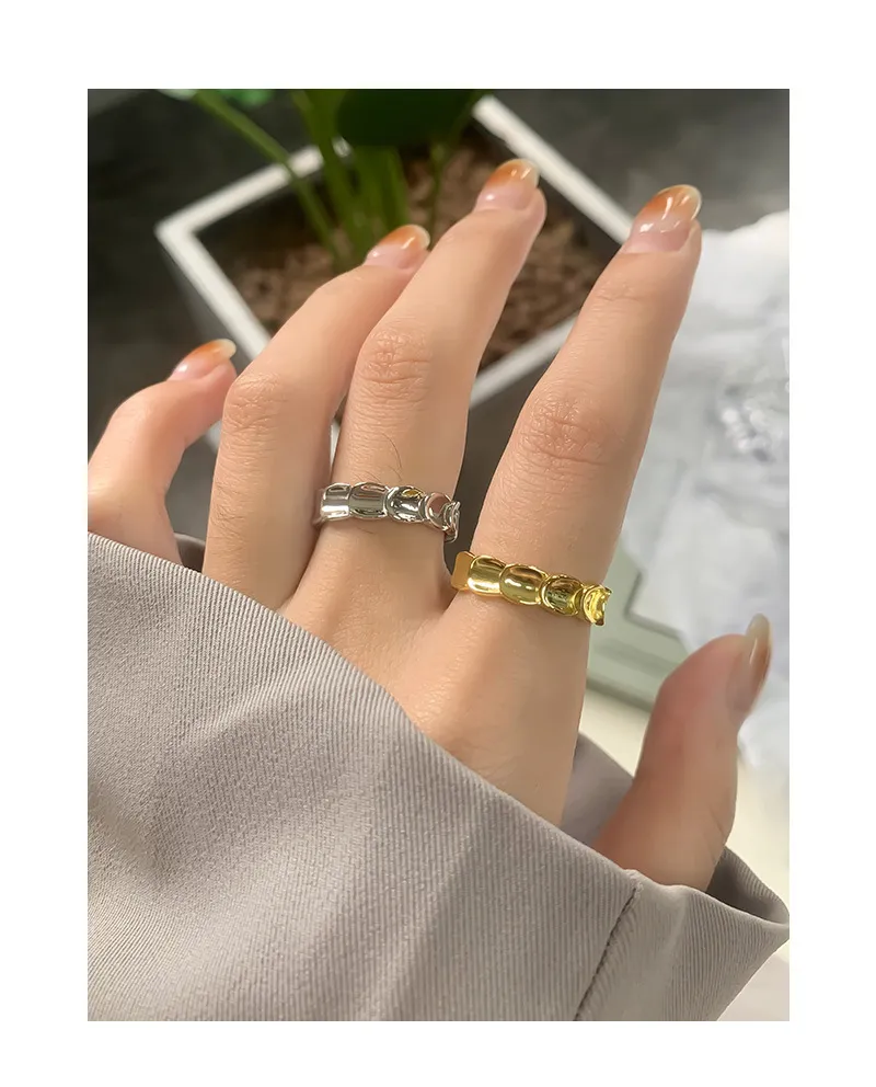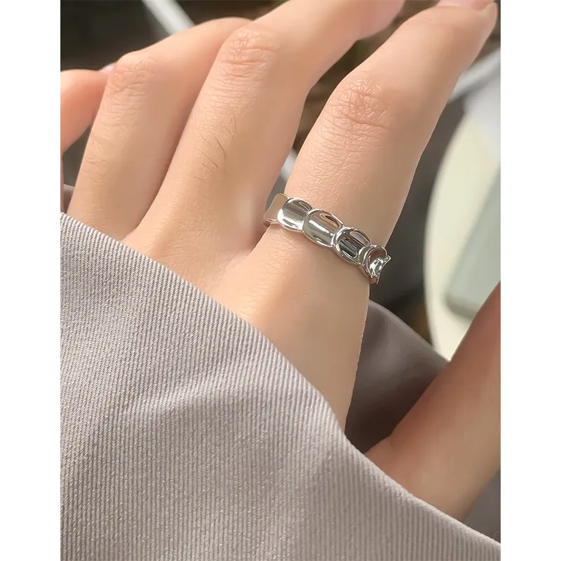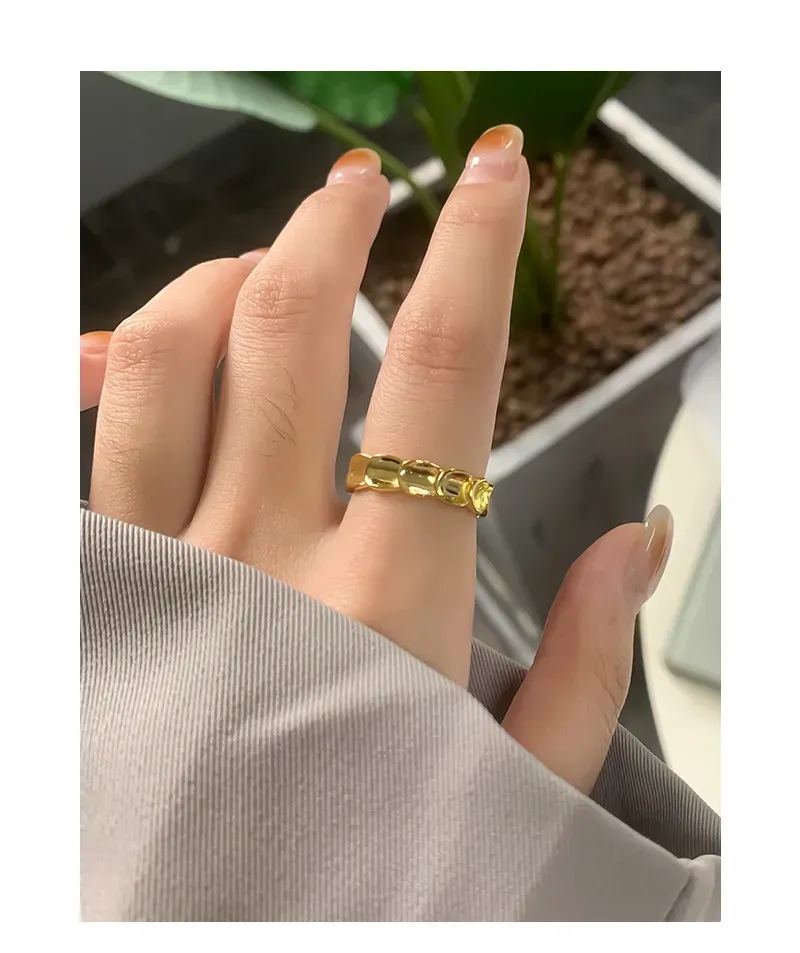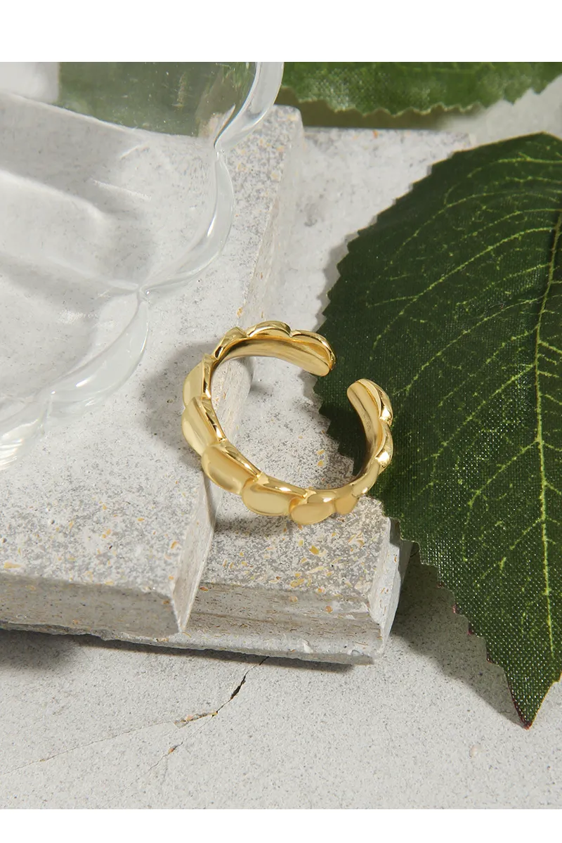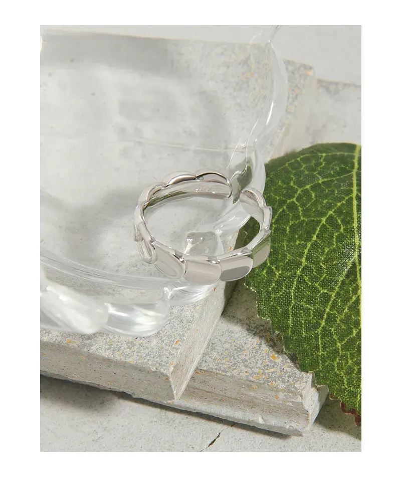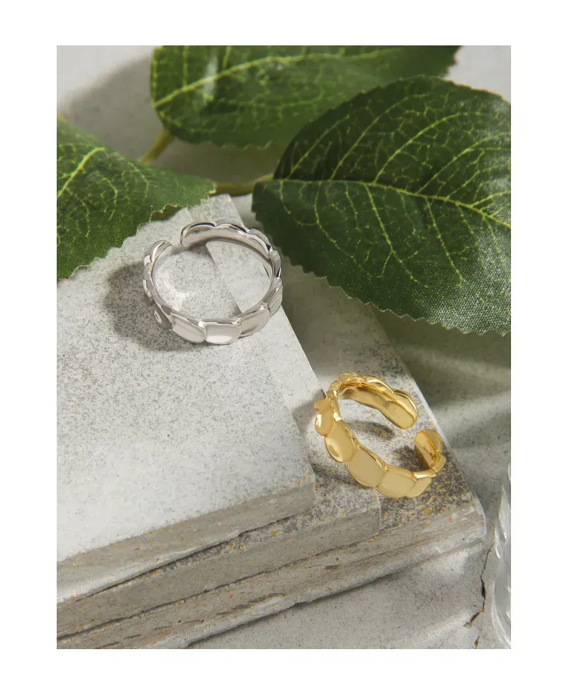 • Patterns or Textures: The band is adorned with a unique pattern of interconnected, flattened oval-like segments. This creates a captivating scalloped texture that wraps gracefully, mimicking the imperfect beauty of nature’s patterns and the delicate balance of raw textures.